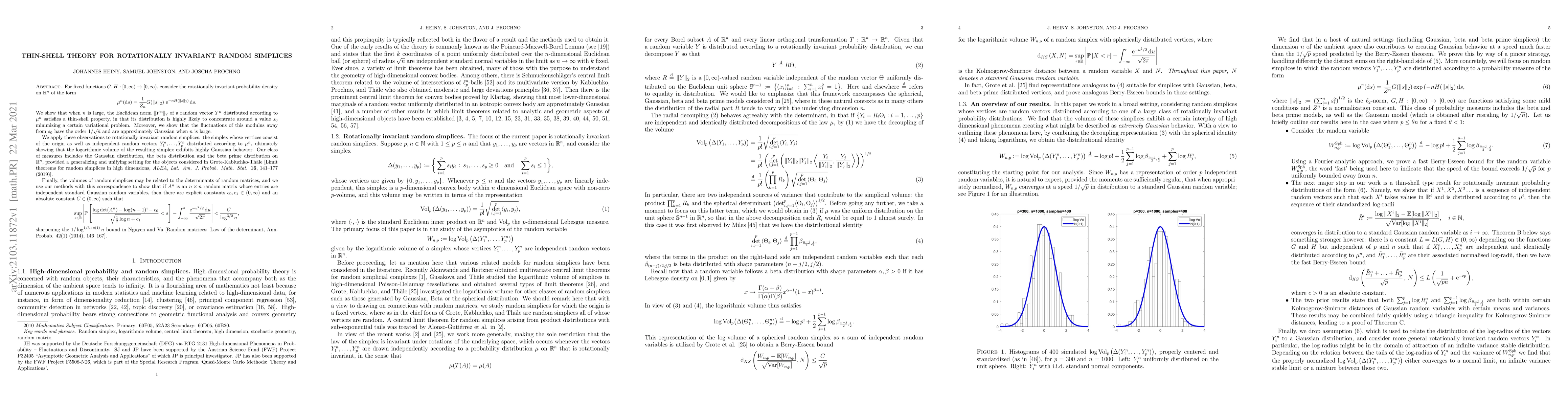 This paper investigates the thin-shell property for rotationally invariant random simplices in high dimensions, demonstrating that their Euclidean norms concentrate around a central value with Gaussian fluctuations. It further shows that the logarithmic volume of these simplices exhibits highly Gaussian behavior, generalizing previous results and linking random simplices to random determinants, thereby improving the bound on the distribution of the logarithm of the determinant of Gaussian random matrices.