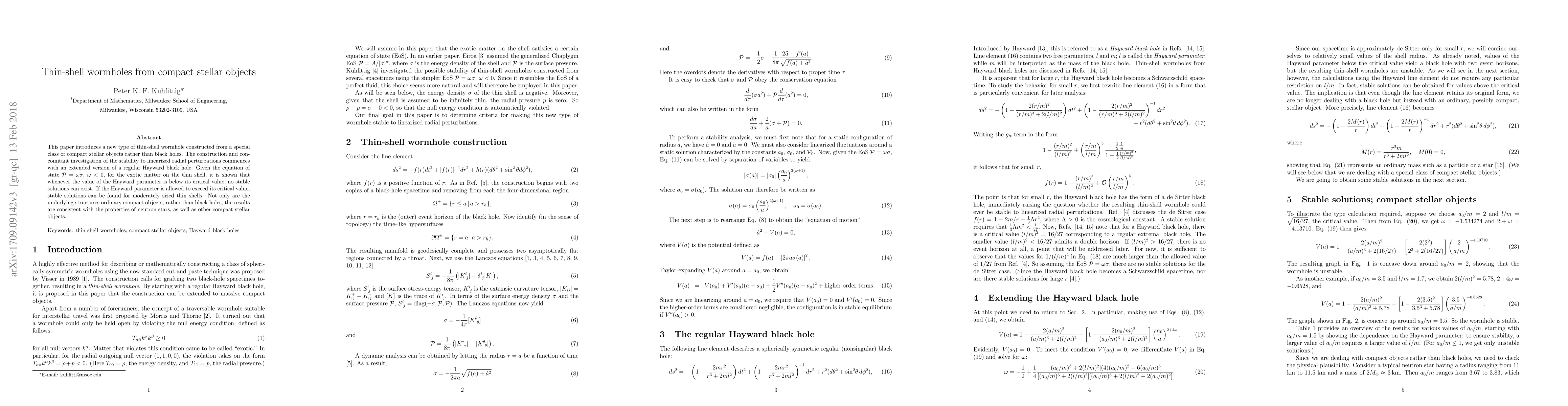 This paper introduces a new type of thin-shell wormhole constructed from a special class of compact stellar objects rather than black holes. The construction and concomitant investigation of the stability to linearized radial perturbations commences with an extended version of a regular Hayward black hole. Given the equation of state $\mathcal{P}=\omega\sigma$, $\omega <0$, for the exotic matter on the thin shell, it is shown that whenever the value of the Hayward parameter is below its critical value, no stable solutions can exist. If the Hayward parameter is allowed to exceed its critical value, stable solutions can be found for moderately sized thin shells. Not only are the underlying structures ordinary compact objects, rather than black holes, the results are consistent with the properties of neutron stars, as well as other compact stellar objects.