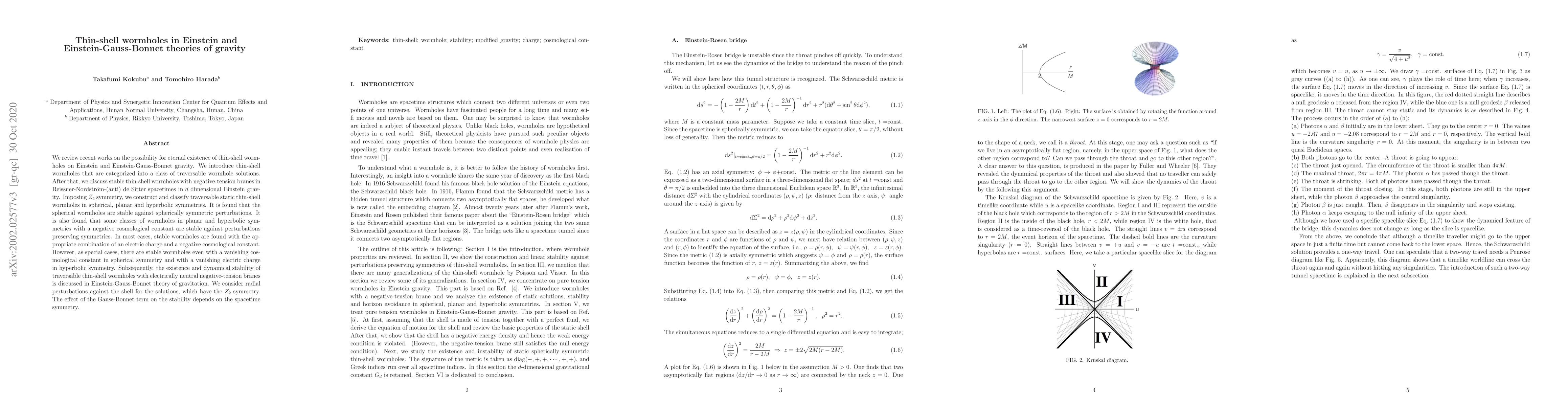 We review recent works on the possibility for eternal existence of thin-shell wormholes on Einstein and Einstein-Gauss-Bonnet gravity. We introduce thin-shell wormholes that are categorized into a class of traversable wormhole solutions. After that, we discuss stable thin-shell wormholes with negative-tension branes in Reissner-Nordstr\"om-(anti) de Sitter spacetimes in $d$ dimensional Einstein gravity. Imposing $Z_2$ symmetry, we construct and classify traversable static thin-shell wormholes in spherical, planar and hyperbolic symmetries. It is found that the spherical wormholes are stable against spherically symmetric perturbations. It is also found that some classes of wormholes in planar and hyperbolic symmetries with a negative cosmological constant are stable against perturbations preserving symmetries. In most cases, stable wormholes are found with the appropriate combination of an electric charge and a negative cosmological constant. However, as special cases, there are stable wormholes even with a vanishing cosmological constant in spherical symmetry and with a vanishing electric charge in hyperbolic symmetry. Subsequently, the existence and dynamical stability of traversable thin-shell wormholes with electrically neutral negative-tension branes is discussed in Einstein-Gauss-Bonnet theory of gravitation. We consider radial perturbations against the shell for the solutions, which have the $Z_2$ symmetry. The effect of the Gauss-Bonnet term on the stability depends on the spacetime symmetry.