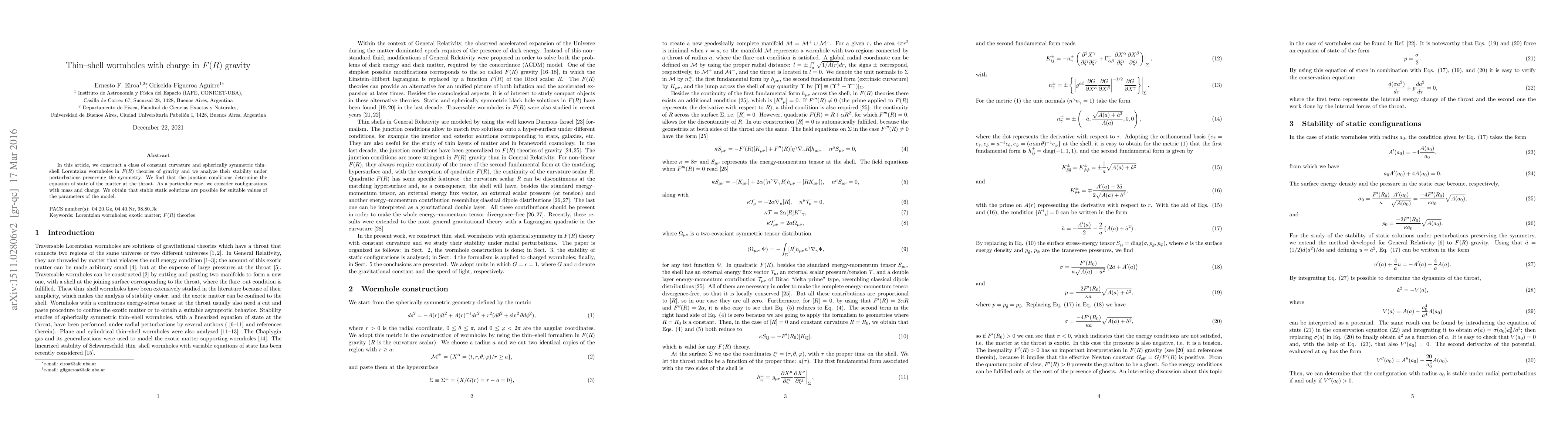 This research extends the thin-shell formalism to F(R) gravity, providing new insights into the conditions for stable, charged wormholes with exotic matter at the throat.