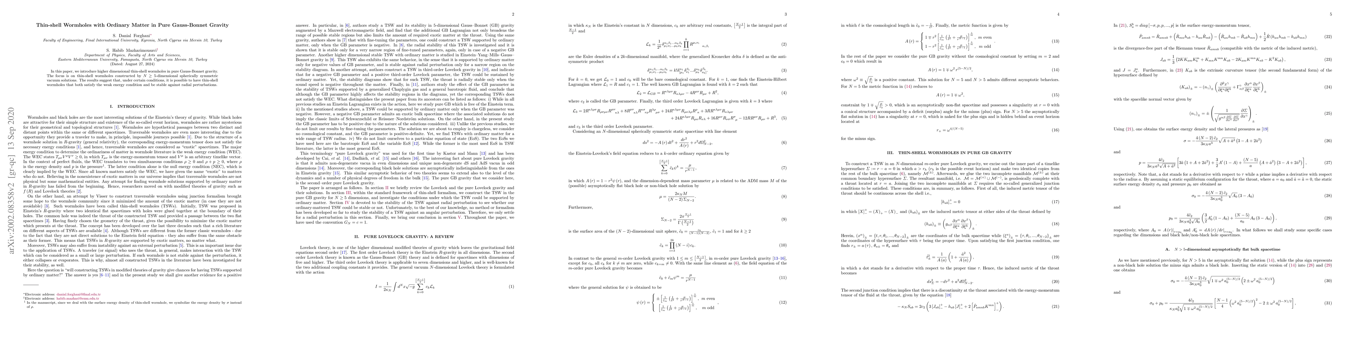 This paper explores higher-dimensional thin-shell wormholes in pure Gauss-Bonnet gravity, demonstrating that under specific conditions, these wormholes can satisfy the weak energy condition and remain stable against radial perturbations.