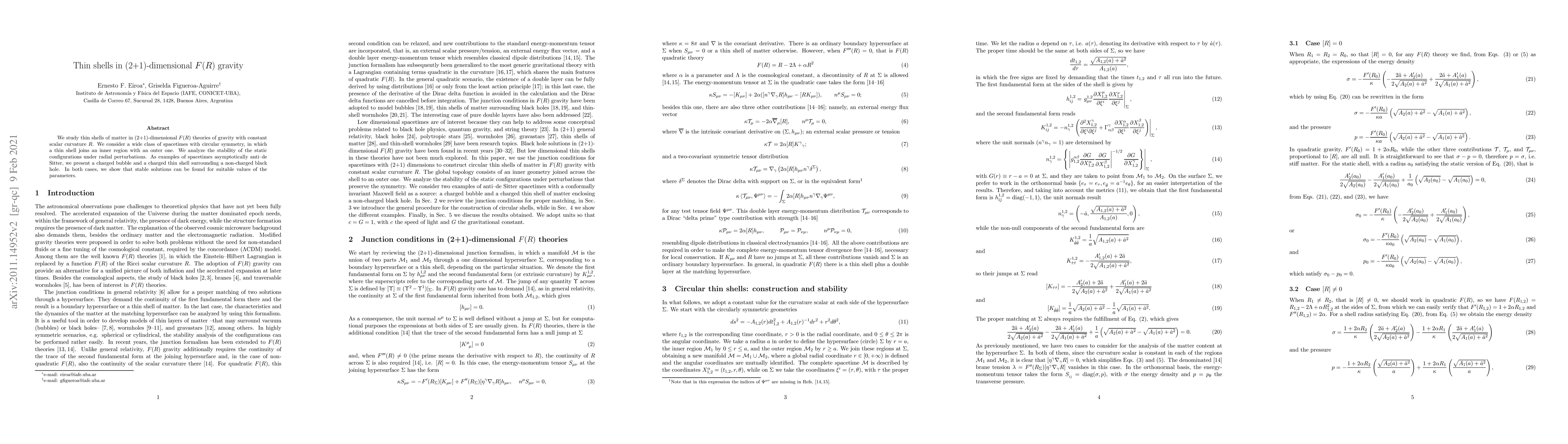 This paper investigates thin shells in (2+1)-dimensional F(R) gravity with constant scalar curvature, focusing on static configurations with circular symmetry. It demonstrates the stability of these configurations under radial perturbations and presents examples of stable charged bubbles and thin shells surrounding non-charged black holes in asymptotically anti-de Sitter spacetimes.