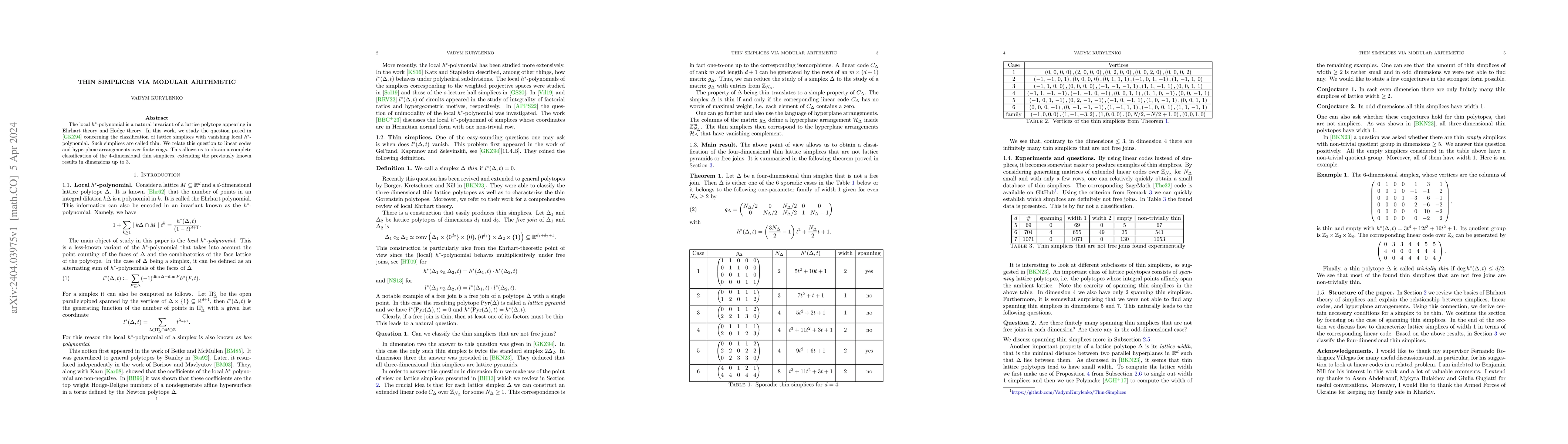 This paper classifies 4-dimensional "thin" simplices, where the local $h^*$-polynomial vanishes, by relating the problem to linear codes and hyperplane arrangements over finite rings, extending previous classifications up to dimension 3.
