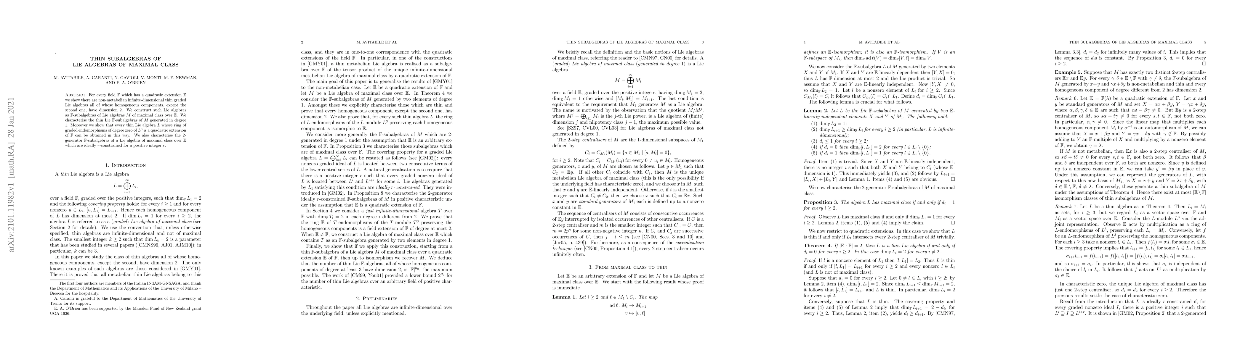 For every field $F$ which has a quadratic extension $E$ we show there are non-metabelian infinite-dimensional thin graded Lie algebras all of whose homogeneous components, except the second one, have dimension $2$. We construct such Lie algebras as $F$-subalgebras of Lie algebras $M$ of maximal class over $E$. We characterise the thin Lie $F$-subalgebras of $M$ generated in degree $1$. Moreover we show that every thin Lie algebra $L$ whose ring of graded endomorphisms of degree zero of $L^3$ is a quadratic extension of $F$ can be obtained in this Lie algebra of maximal class over $E$ which are ideally $r$-constrained for a positive integer $r$.