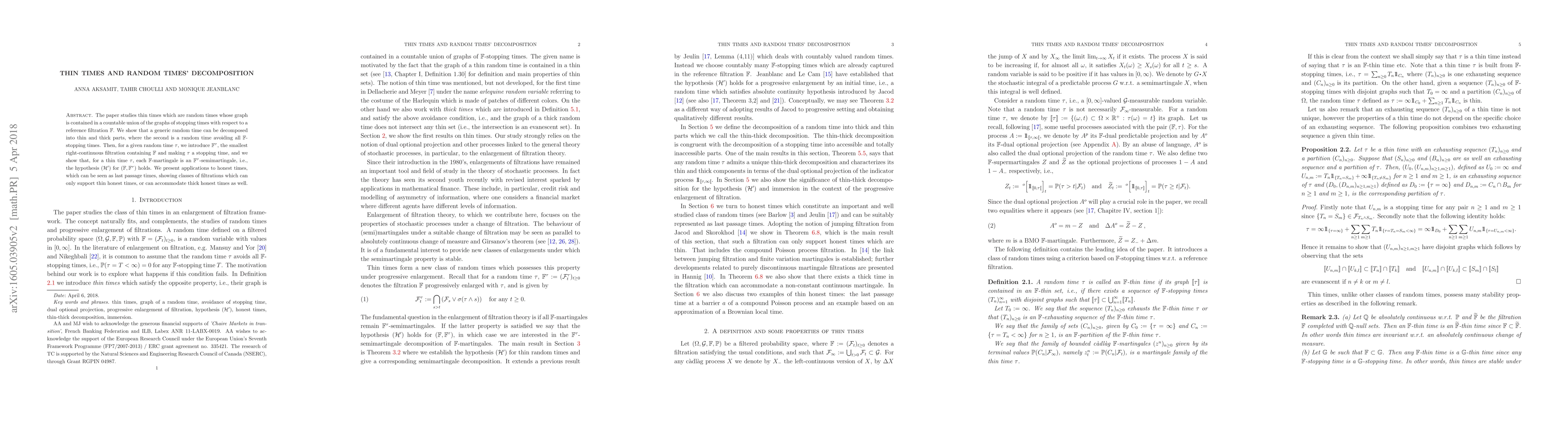 The paper studies thin times which are random times whose graph is contained in a countable union of the graphs of stopping times with respect to a reference filtration $\mathbb F$. We show that a generic random time can be decomposed into thin and thick parts, where the second is a random time avoiding all $\mathbb F$-stopping times. Then, for a given random time $\tau$, we introduce ${\mathbb F}^\tau$, the smallest right-continuous filtration containing $\mathbb F$ and making $\tau$ a stopping time, and we show that, for a thin time $\tau$, each $\mathbb F$-martingale is an ${\mathbb F}^\tau$-semimartingale, i.e., the hypothesis $({\mathcal H}^\prime)$ for $(\mathbb F, {\mathbb F}^\tau)$ holds. We present applications to honest times, which can be seen as last passage times, showing classes of filtrations which can only support thin honest times, or can accommodate thick honest times as well.