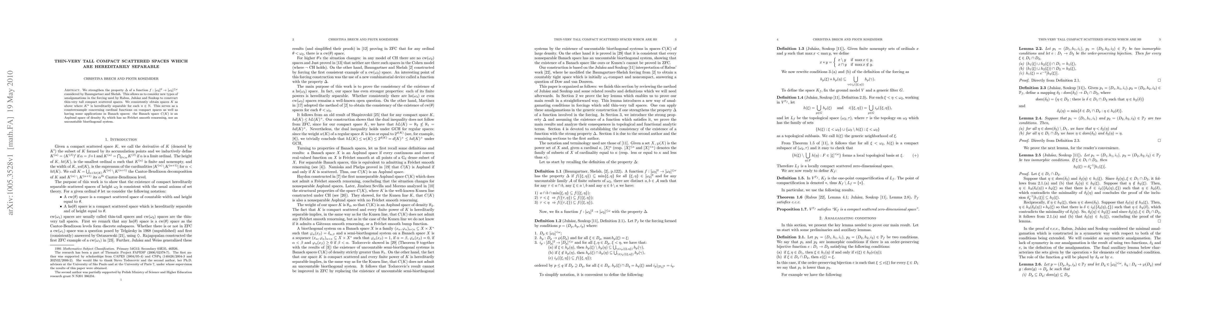 This paper enhances a property ($\Delta$) of functions in Baumgartner and Shelah's work to construct thin-very tall compact scattered spaces where each power $K^n$ is hereditarily separable, challenging cardinal functions on compact spaces and demonstrating properties of Banach spaces, specifically $C(K)$.
