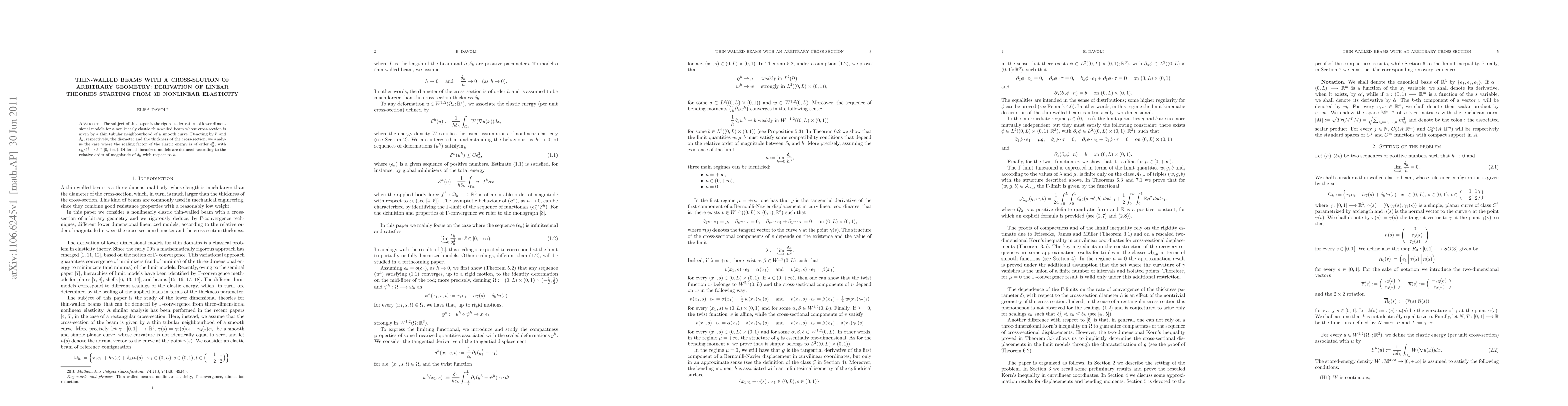 This paper rigorously derives lower-dimensional linear models for thin-walled beams from 3D nonlinear elasticity, focusing on beams with arbitrary cross-sectional geometries. It examines scaling behaviors of the elastic energy and deduces different linearized models based on the relative magnitudes of the cross-sectional thickness and diameter.