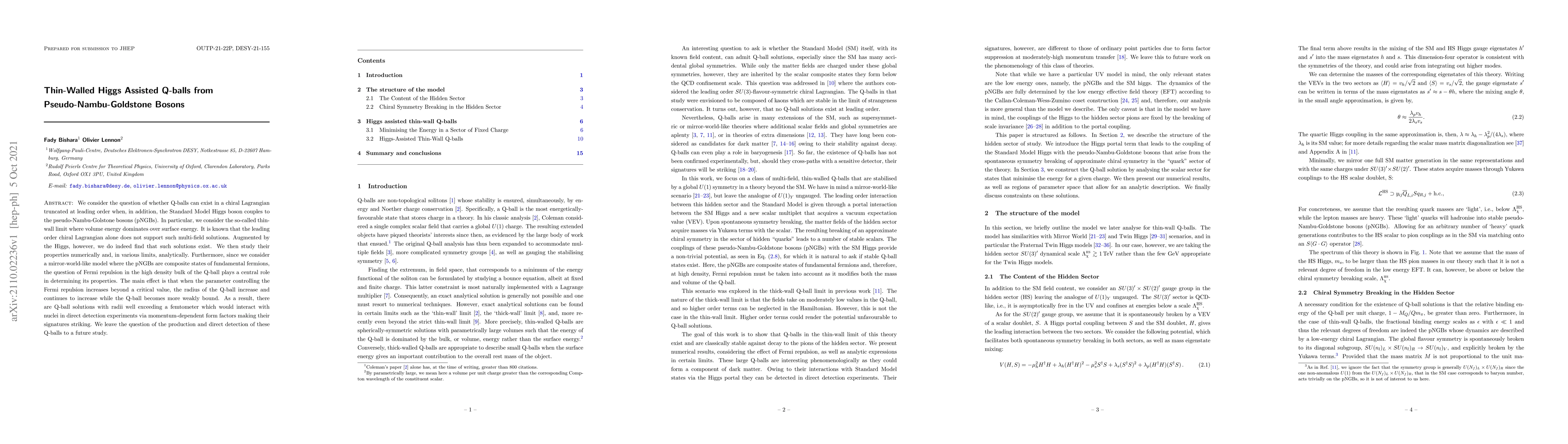 We consider the question of whether Q-balls can exist in a chiral Lagrangian truncated at leading order when, in addition, the Standard Model Higgs boson couples to the pseudo-Nambu-Golstone bosons (pNGBs). In particular, we consider the so-called thin-wall limit where volume energy dominates over surface energy. It is known that the leading order chiral Lagrangian alone does not support such multi-field solutions. Augmented by the Higgs, however, we do indeed find that such solutions exist. We then study their properties numerically and, in various limits, analytically. Furthermore, since we consider a mirror-world-like model where the pNGBs are composite states of fundamental fermions, the question of Fermi repulsion in the high density bulk of the Q-ball plays a central role in determining its properties. The main effect is that when the parameter controlling the Fermi repulsion increases beyond a critical value, the radius of the Q-ball increase and continues to increase while the Q-ball becomes more weakly bound. As a result, there are Q-ball solutions with radii well exceeding a femtometer which would interact with nuclei in direct detection experiments via momentum-dependent form factors making their signatures striking. We leave the question of the production and direct detection of these Q-balls to a future study.