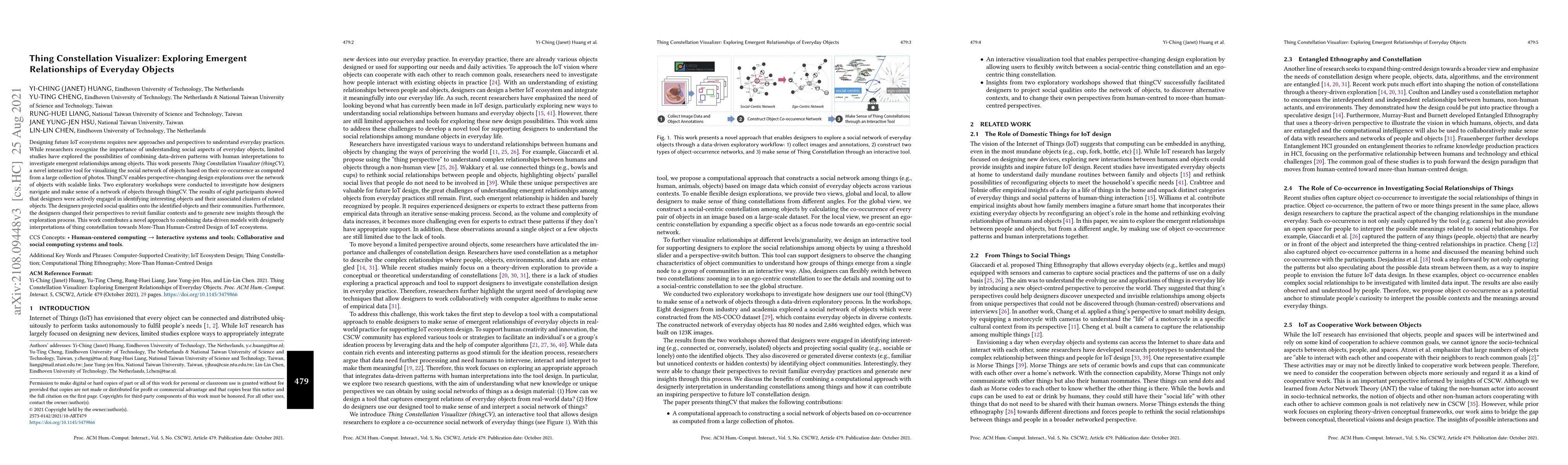 This paper introduces Thing Constellation Visualizer (thingCV), an interactive tool for visualizing social networks of everyday objects based on photo co-occurrence data. Workshops with designers showed that thingCV helps identify object relationships and fosters new insights, contributing to More-Than Human-Centred Design in IoT ecosystems.