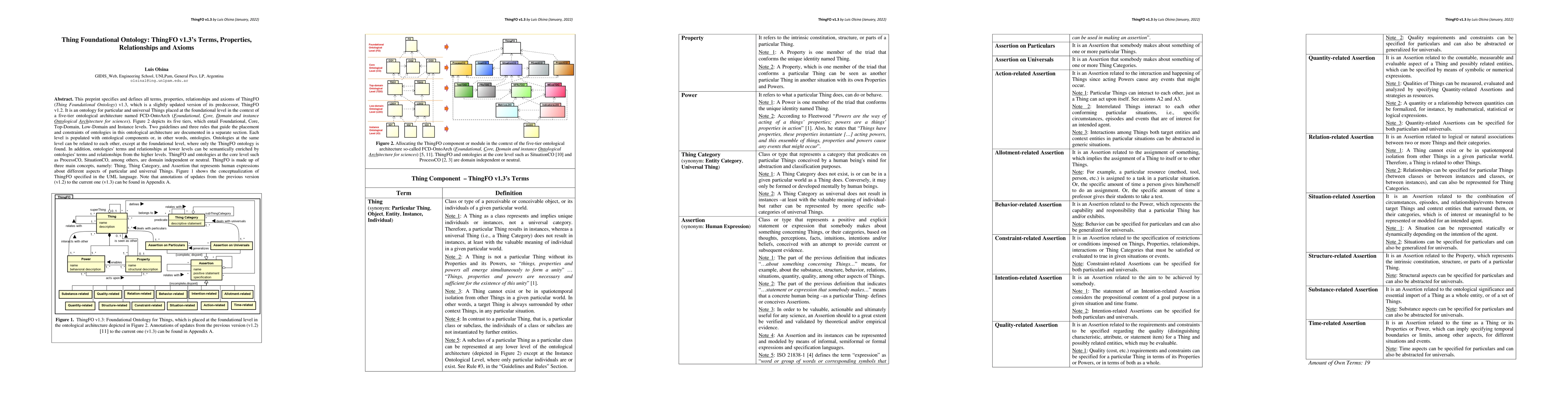 This preprint specifies and defines all terms, properties, relationships and axioms of ThingFO (Thing Foundational Ontology) v1.3, which is a slightly updated version of its predecessor, ThingFO v1.2. It is an ontology for particular and universal Things placed at the foundational level in the context of a five-tier ontological architecture named FCD-OntoArch (Foundational, Core, Domain and instance Ontological Architecture for sciences). Figure 2 depicts its five tiers, which entail Foundational, Core, Top-Domain, Low-Domain and Instance levels. Two guidelines and three rules that guide the placement and constraints of ontologies in this ontological architecture are documented in a separate section. Each level is populated with ontological components or, in other words, ontologies. Ontologies at the same level can be related to each other, except at the foundational level, where only the ThingFO ontology is found. In addition, ontologies' terms and relationships at lower levels can be semantically enriched by ontologies' terms and relationships from the higher levels. ThingFO and ontologies at the core level such as ProcessCO, SituationCO, among others, are domain independent or neutral. ThingFO is made up of three main concepts, namely: Thing, Thing Category, and Assertion that represents human expressions about different aspects of particular and universal Things. Figure 1 shows the conceptualization of ThingFO specified in the UML language. Note that annotations of updates from the previous version (v1.2) to the current one (v1.3) can be found in Appendix A.