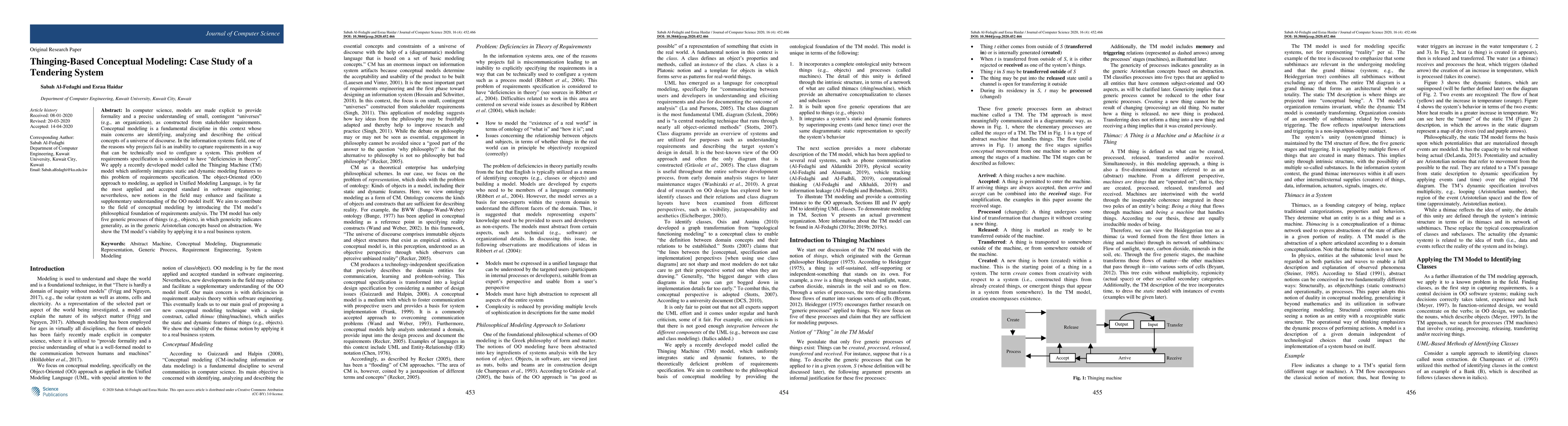 In computer science, models are made explicit to provide formality and a precise understanding of small, contingent universes (e.g., an organization), as constructed from stakeholder requirements. Conceptual modeling is a fundamental discipline in this context whose main concerns are identifying, analyzing and describing the critical concepts of a universe of discourse. In the information systems field, one of the reasons why projects fail is an inability to capture requirements in a way that can be technically used to configure a system. This problem of requirements specification is considered to have deficiencies in theory. We apply a recently developed model called the Thinging Machine (TM) model which uniformly integrates static and dynamic modeling features to this problem of requirements specification. The object-Oriented (OO) approach to modeling, as applied in Unified Modeling Language, is by far the most applied and accepted standard in software engineering; nevertheless, new notions in the field may enhance and facilitate a supplementary understanding of the OO model itself. We aim to contribute to the field of conceptual modeling by introducing the TM model s philosophical foundation of requirements analysis. The TM model has only five generic processes of things (e.g., objects), in which genericity indicates generality, as in the generic Aristotelian concepts based on abstraction. We show the TM model s viability by applying it to a real business system.