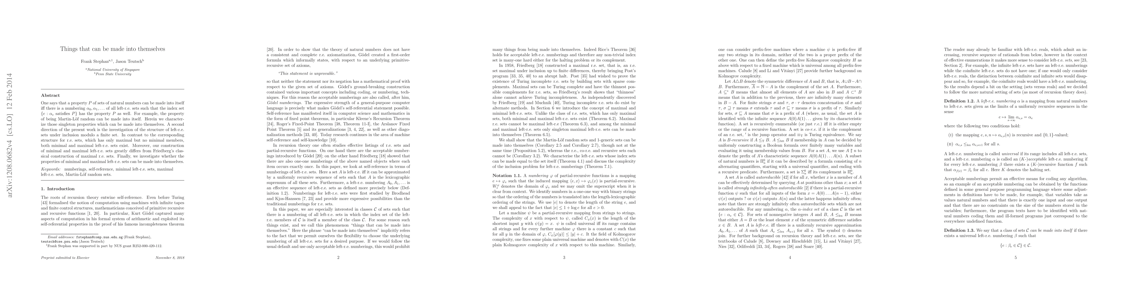 This paper investigates whether certain properties of sets can be made into themselves, a concept related to Martin-Löf randomness, and explores the structure of left-r.e. sets under inclusion modulo a finite set.