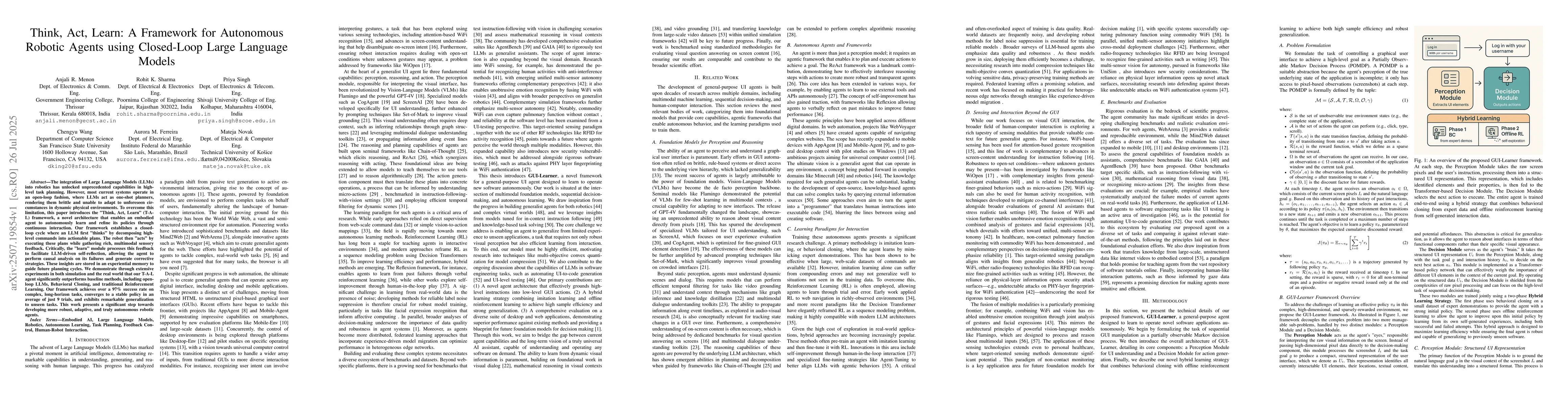 The integration of Large Language Models (LLMs) into robotics has unlocked unprecedented capabilities in high-level task planning. However, most current systems operate in an open-loop fashion, where LLMs act as one-shot planners, rendering them brittle and unable to adapt to unforeseen circumstances in dynamic physical environments. To overcome this limitation, this paper introduces the "Think, Act, Learn" (T-A-L) framework, a novel architecture that enables an embodied agent to autonomously learn and refine its policies through continuous interaction. Our framework establishes a closed-loop cycle where an LLM first "thinks" by decomposing high-level commands into actionable plans. The robot then "acts" by executing these plans while gathering rich, multimodal sensory feedback. Critically, the "learn" module processes this feedback to facilitate LLM-driven self-reflection, allowing the agent to perform causal analysis on its failures and generate corrective strategies. These insights are stored in an experiential memory to guide future planning cycles. We demonstrate through extensive experiments in both simulation and the real world that our T-A-L agent significantly outperforms baseline methods, including open-loop LLMs, Behavioral Cloning, and traditional Reinforcement Learning. Our framework achieves over a 97% success rate on complex, long-horizon tasks, converges to a stable policy in an average of just 9 trials, and exhibits remarkable generalization to unseen tasks. This work presents a significant step towards developing more robust, adaptive, and truly autonomous robotic agents.