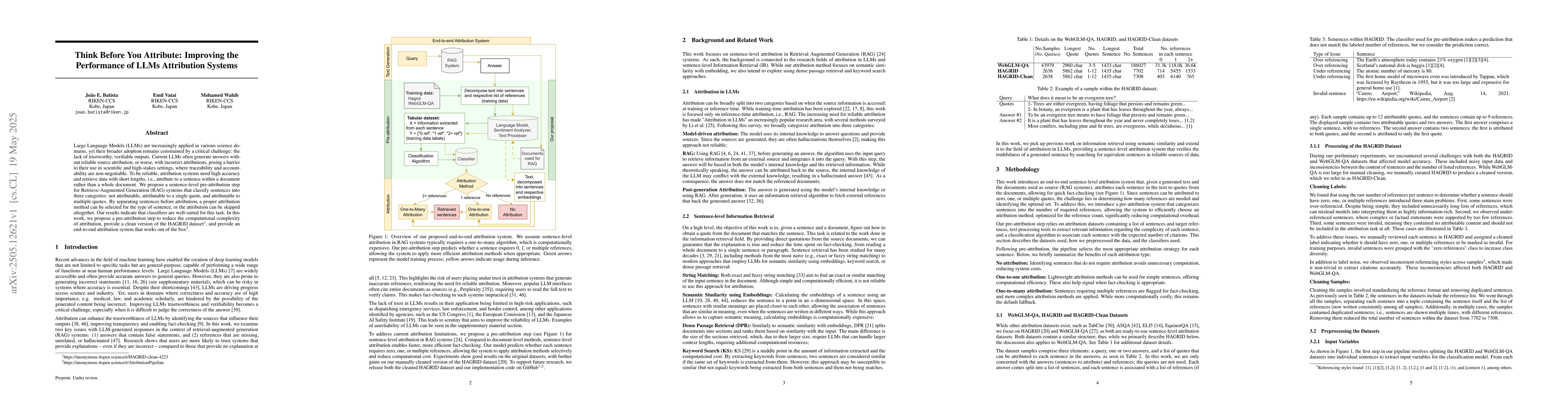 This work distinguishes itself by focusing on a sentence-level pre-attribution strategy, which hasn't been extensively explored in LLM attribution systems, and by providing a clean version of the HAGRID dataset along with an end-to-end attribution system.