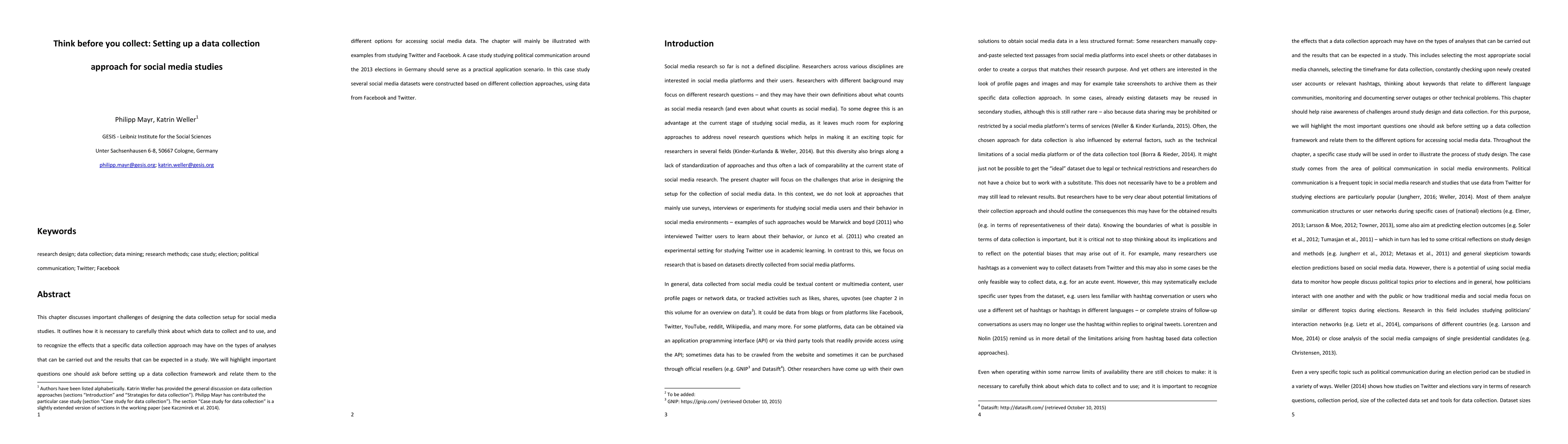 This chapter discusses important challenges of designing the data collection setup for social media studies. It outlines how it is necessary to carefully think about which data to collect and to use, and to recognize the effects that a specific data collection approach may have on the types of analyses that can be carried out and the results that can be expected in a study. We will highlight important questions one should ask before setting up a data collection framework and relate them to the different options for accessing social media data. The chapter will mainly be illustrated with examples from studying Twitter and Facebook. A case study studying political communication around the 2013 elections in Germany should serve as a practical application scenario. In this case study we constructed several social media datasets based on different collection approaches, using data from Facebook and Twitter.
