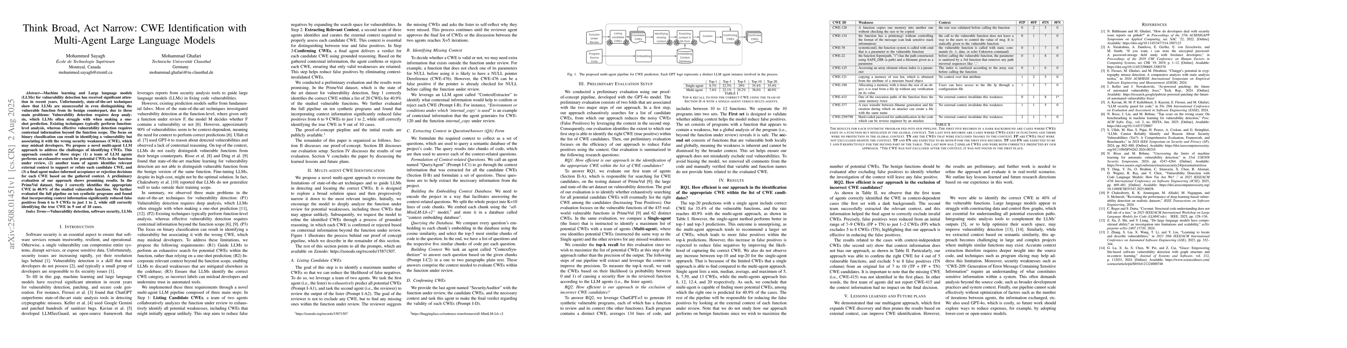 Machine learning and Large language models (LLMs) for vulnerability detection has received significant attention in recent years. Unfortunately, state-of-the-art techniques show that LLMs are unsuccessful in even distinguishing the vulnerable function from its benign counterpart, due to three main problems: Vulnerability detection requires deep analysis, which LLMs often struggle with when making a one-shot prediction. Existing techniques typically perform function-level analysis, whereas effective vulnerability detection requires contextual information beyond the function scope. The focus on binary classification can result in identifying a vulnerability but associating it with the wrong security weaknesses (CWE), which may mislead developers. We propose a novel multi-agent LLM approach to address the challenges of identifying CWEs. This approach consists of three steps: (1) a team of LLM agents performs an exhaustive search for potential CWEs in the function under review, (2) another team of agents identifies relevant external context to support or refute each candidate CWE, and (3) a final agent makes informed acceptance or rejection decisions for each CWE based on the gathered context. A preliminary evaluation of our approach shows promising results. In the PrimeVul dataset, Step 1 correctly identifies the appropriate CWE in 40.9\% of the studied vulnerable functions. We further evaluated the full pipeline on ten synthetic programs and found that incorporating context information significantly reduced false positives from 6 to 9 CWEs to just 1 to 2, while still correctly identifying the true CWE in 9 out of 10 cases.