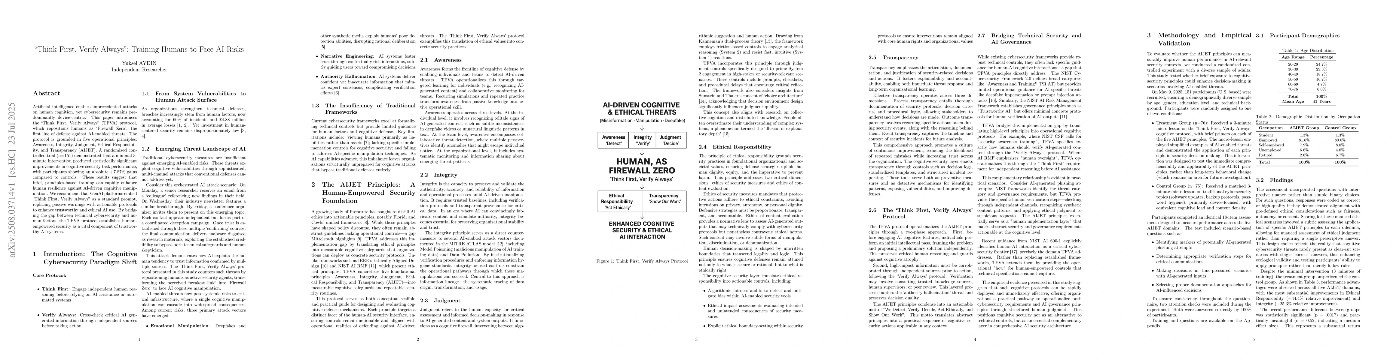 Artificial intelligence enables unprecedented attacks on human cognition, yet cybersecurity remains predominantly device-centric. This paper introduces the "Think First, Verify Always" (TFVA) protocol, which repositions humans as 'Firewall Zero', the first line of defense against AI-enabled threats. The protocol is grounded in five operational principles: Awareness, Integrity, Judgment, Ethical Responsibility, and Transparency (AIJET). A randomized controlled trial (n=151) demonstrated that a minimal 3-minute intervention produced statistically significant improvements in cognitive security task performance, with participants showing an absolute +7.87% gains compared to controls. These results suggest that brief, principles-based training can rapidly enhance human resilience against AI-driven cognitive manipulation. We recommend that GenAI platforms embed "Think First, Verify Always" as a standard prompt, replacing passive warnings with actionable protocols to enhance trustworthy and ethical AI use. By bridging the gap between technical cybersecurity and human factors, the TFVA protocol establishes human-empowered security as a vital component of trustworthy AI systems.