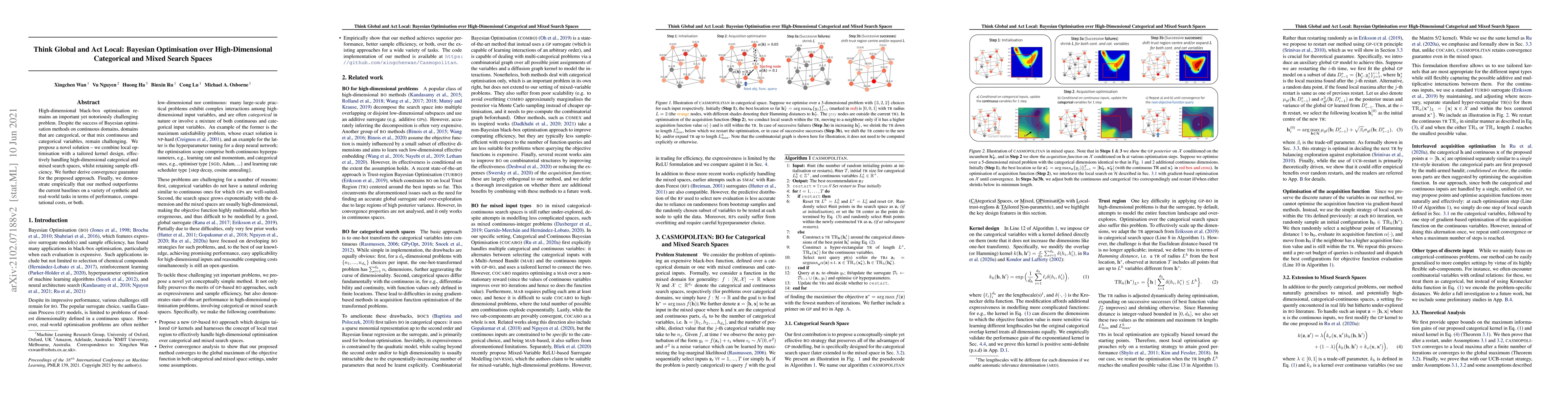 This paper proposes a novel Bayesian optimisation method combining local optimisation with a tailored kernel design to efficiently handle high-dimensional categorical and mixed search spaces. The method is shown to outperform current baselines on various tasks, demonstrating both improved performance and reduced computational costs.