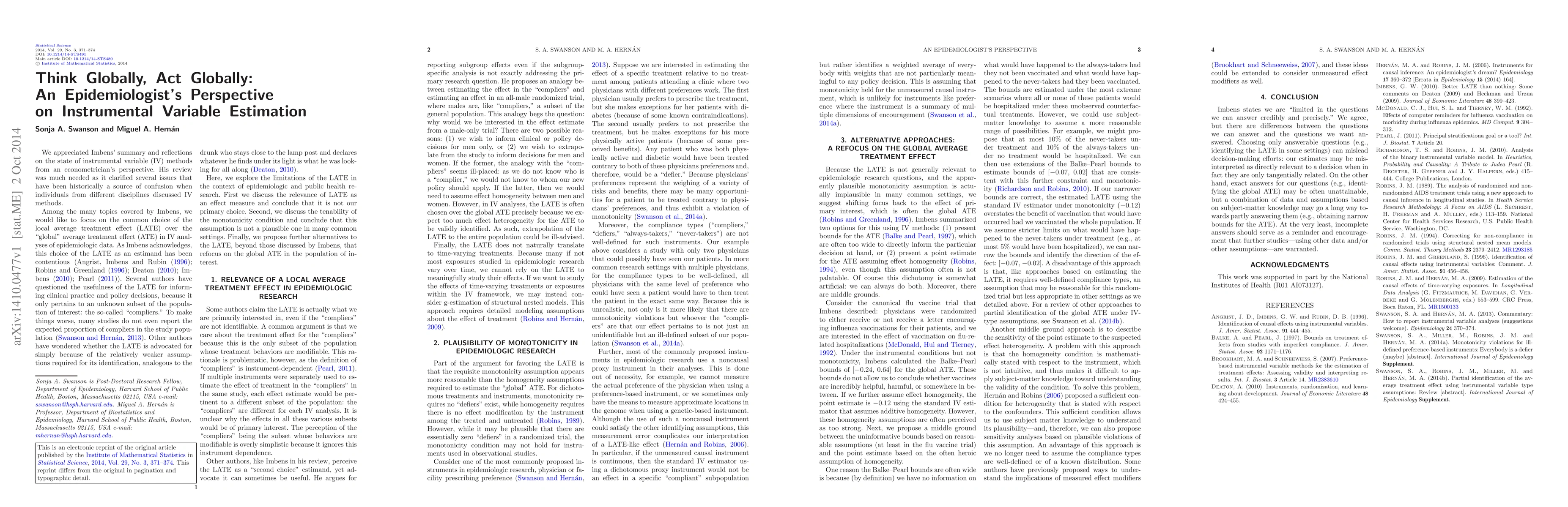 Discussion of "Instrumental Variables: An Econometrician's Perspective" by Guido W. Imbens [arXiv:1410.0163].