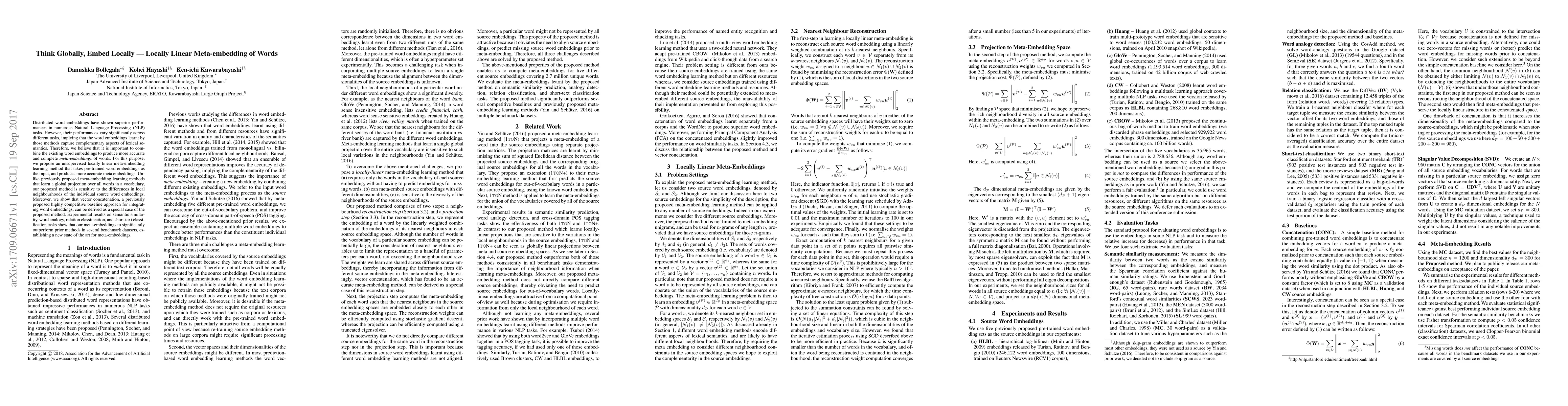 Distributed word embeddings have shown superior performances in numerous Natural Language Processing (NLP) tasks. However, their performances vary significantly across different tasks, implying that the word embeddings learnt by those methods capture complementary aspects of lexical semantics. Therefore, we believe that it is important to combine the existing word embeddings to produce more accurate and complete \emph{meta-embeddings} of words. For this purpose, we propose an unsupervised locally linear meta-embedding learning method that takes pre-trained word embeddings as the input, and produces more accurate meta embeddings. Unlike previously proposed meta-embedding learning methods that learn a global projection over all words in a vocabulary, our proposed method is sensitive to the differences in local neighbourhoods of the individual source word embeddings. Moreover, we show that vector concatenation, a previously proposed highly competitive baseline approach for integrating word embeddings, can be derived as a special case of the proposed method. Experimental results on semantic similarity, word analogy, relation classification, and short-text classification tasks show that our meta-embeddings to significantly outperform prior methods in several benchmark datasets, establishing a new state of the art for meta-embeddings.