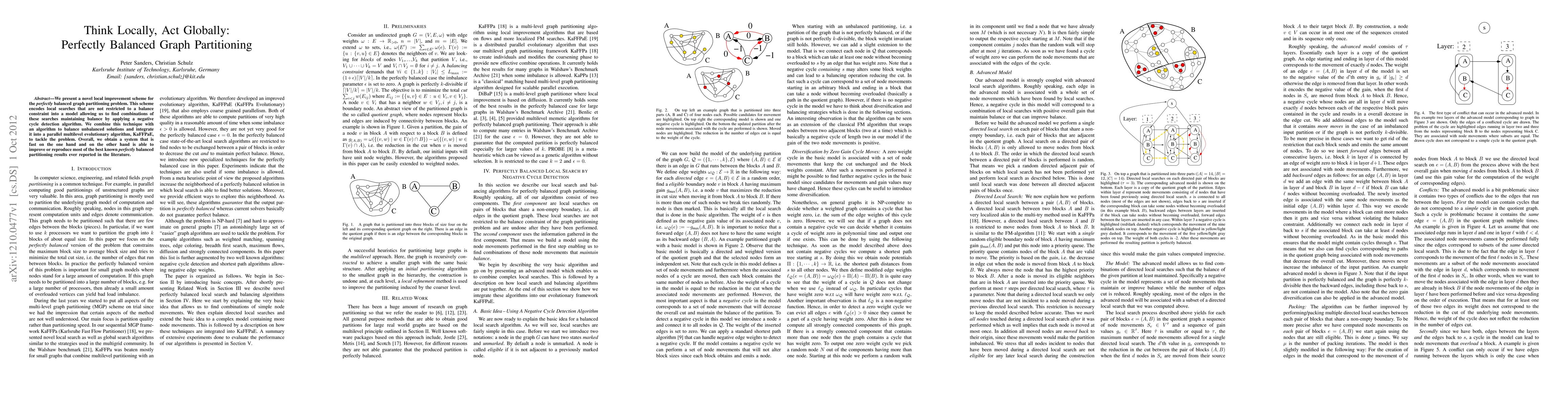 This paper introduces a local improvement scheme for perfectly balanced graph partitioning, combining local search with a balance constraint via a negative cycle detection algorithm, and integrating it into a parallel evolutionary algorithm, KaFFPaE, achieving fast performance and competitive results.