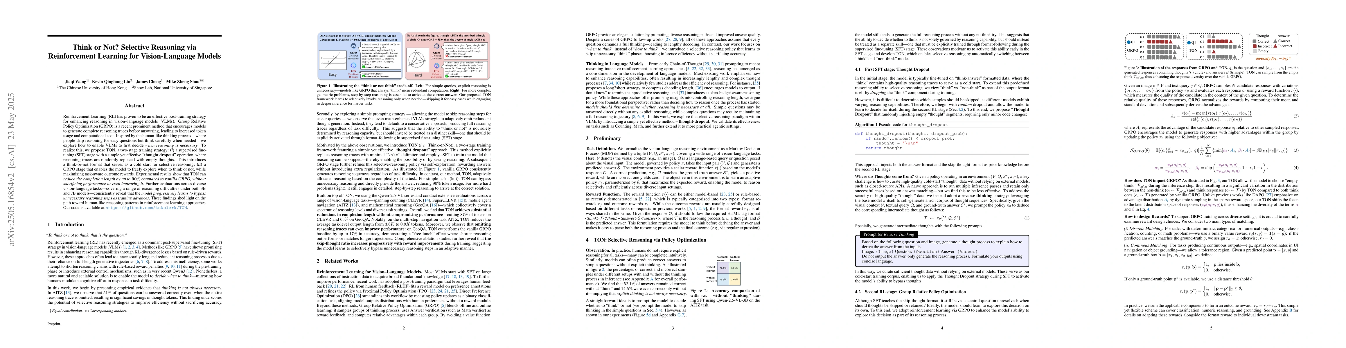 The research introduces TON, a two-stage training strategy for vision-language models (VLMs) that combines supervised fine-tuning (SFT) with a 'thought dropout' operation to encourage selective reasoning. The second stage employs Group Relative Policy Optimization (GRPO) for reinforcement learning, allowing models to decide when reasoning is necessary.