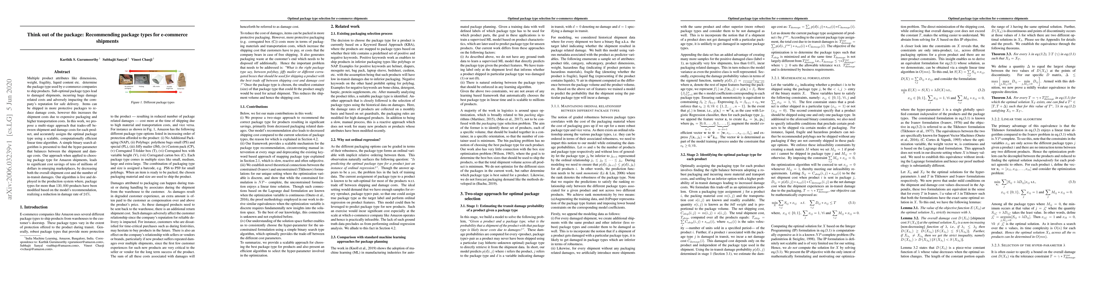 This paper proposes a multi-stage algorithm to recommend optimal package types for e-commerce shipments, balancing shipment and damage costs. The approach achieves significant cost savings and a 24% reduction in damage rates by deploying a scalable linear time algorithm and a binary search for hyper-parameter tuning.