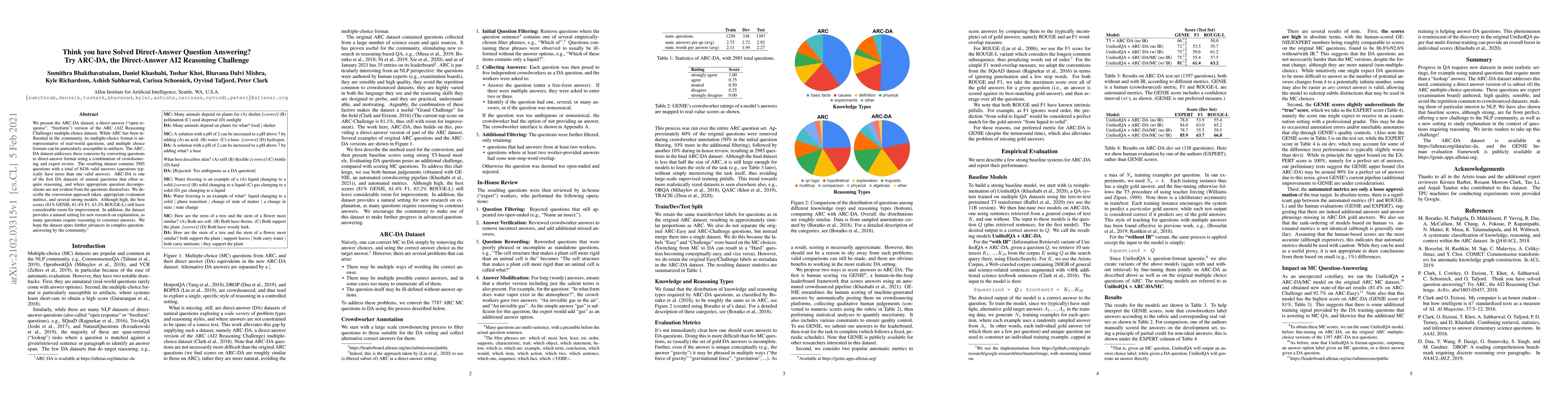 Researchers introduced ARC-DA, a direct-answer question answering dataset that addresses limitations of existing multiple-choice formats, offering new opportunities for research on complex question answering.