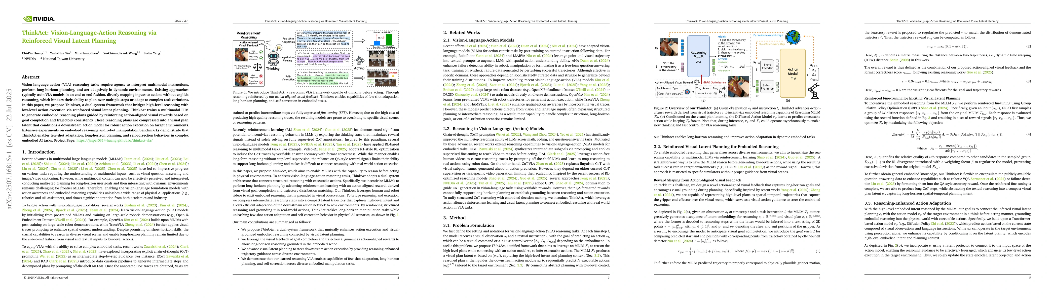 The research proposes ThinkAct, a dual-system framework that combines high-level reasoning with low-level action execution via reinforced visual latent planning. It trains a multimodal large language model (LLM) to generate embodied reasoning plans guided by reinforcing action-aligned visual rewards, which are then compressed into a visual plan latent to condition a downstream action model.