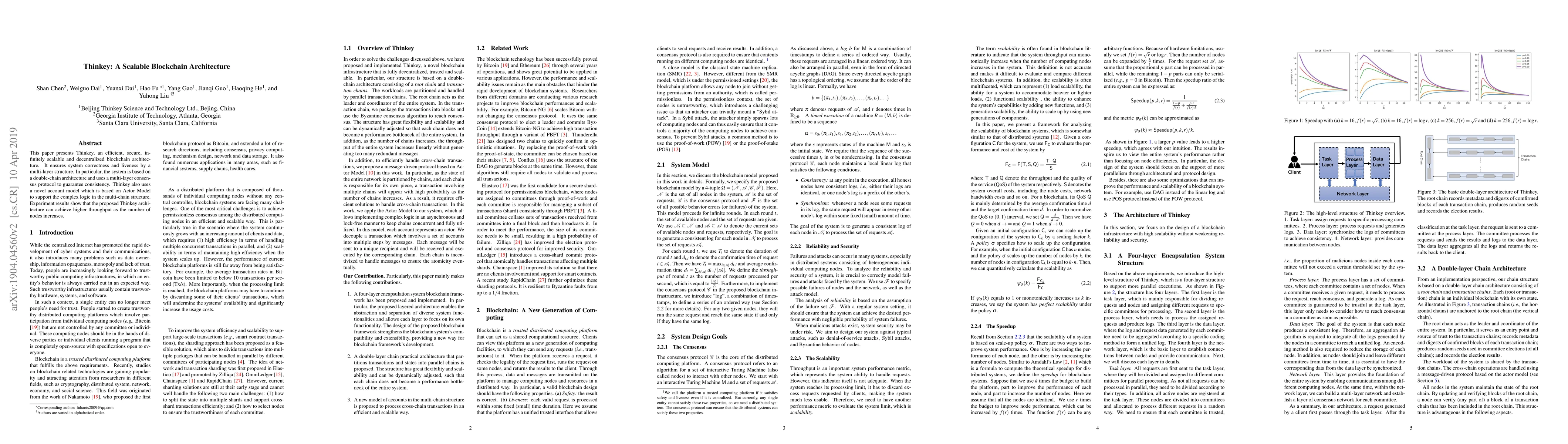 This paper presents Thinkey, an efficient, secure, infinitely scalable and decentralized blockchain architecture. It ensures system correctness and liveness by a multi-layer structure. In particular, the system is based on a double-chain architecture and uses a multi-layer consensus protocol to guarantee consistency. Thinkey also uses a novel account model which is based on Actor Model to support the complex logic in the multi-chain structure. Experiment results show that the proposed Thinkey architecture can achieve higher throughput as the number of nodes increases.