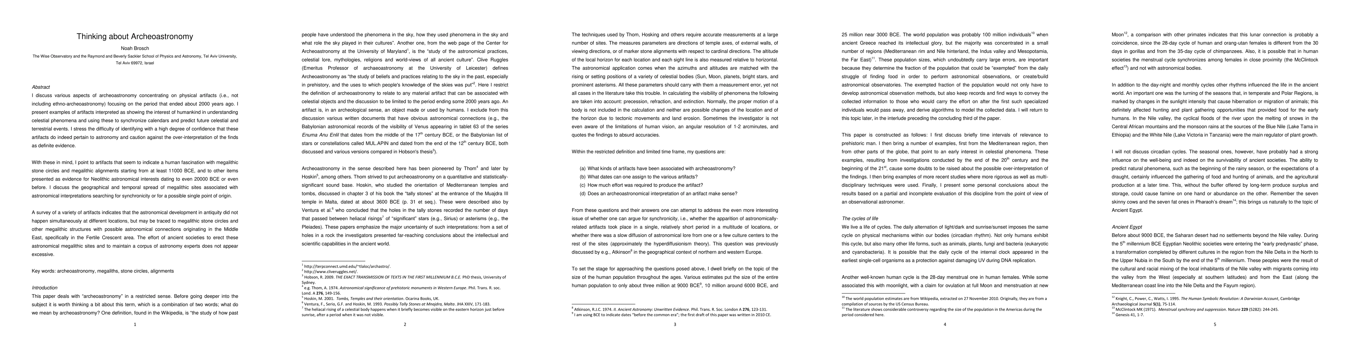 This paper explores ancient physical artifacts related to archeoastronomy, emphasizing the use of megalithic structures to track celestial phenomena and synchronize calendars. It highlights the complexity of confidently attributing these artifacts to astronomy and cautions against over-interpretation, while noting the spread of megalithic sites with astronomical significance, suggesting a possible origin in the Middle East.