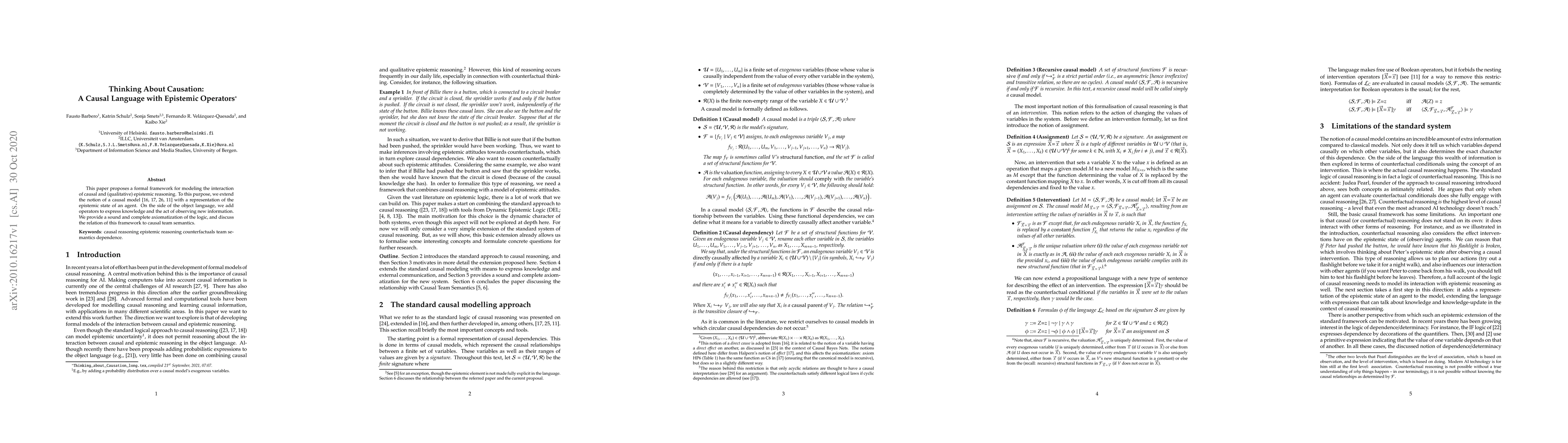 This paper introduces a formal framework that combines causal and epistemic reasoning by extending causal models to include epistemic states. It introduces operators to express knowledge and observation, providing a sound and complete axiomatization and discussing its relation to causal team semantics.