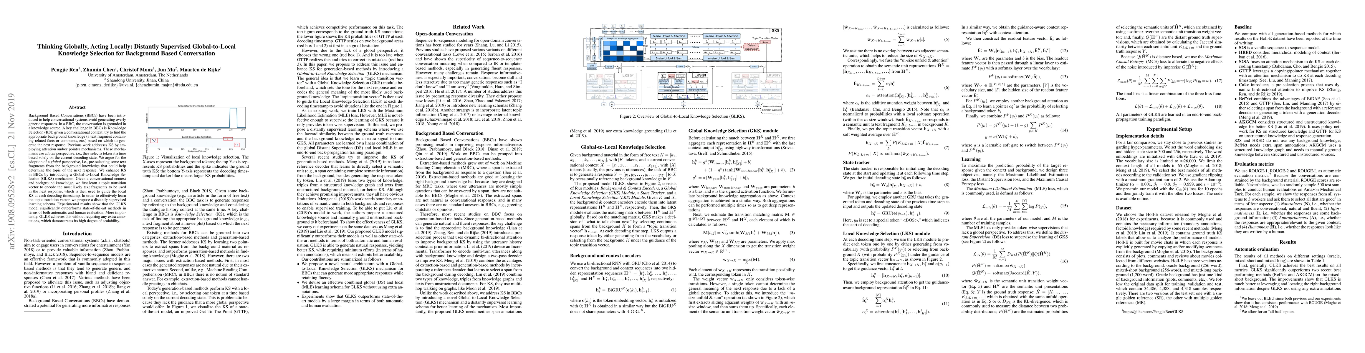 Background Based Conversations (BBCs) have been introduced to help conversational systems avoid generating overly generic responses. In a BBC, the conversation is grounded in a knowledge source. A key challenge in BBCs is Knowledge Selection (KS): given a conversational context, try to find the appropriate background knowledge (a text fragment containing related facts or comments, etc.) based on which to generate the next response. Previous work addresses KS by employing attention and/or pointer mechanisms. These mechanisms use a local perspective, i.e., they select a token at a time based solely on the current decoding state. We argue for the adoption of a global perspective, i.e., pre-selecting some text fragments from the background knowledge that could help determine the topic of the next response. We enhance KS in BBCs by introducing a Global-to-Local Knowledge Selection (GLKS) mechanism. Given a conversational context and background knowledge, we first learn a topic transition vector to encode the most likely text fragments to be used in the next response, which is then used to guide the local KS at each decoding timestamp. In order to effectively learn the topic transition vector, we propose a distantly supervised learning schema. Experimental results show that the GLKS model significantly outperforms state-of-the-art methods in terms of both automatic and human evaluation. More importantly, GLKS achieves this without requiring any extra annotations, which demonstrates its high degree of scalability.