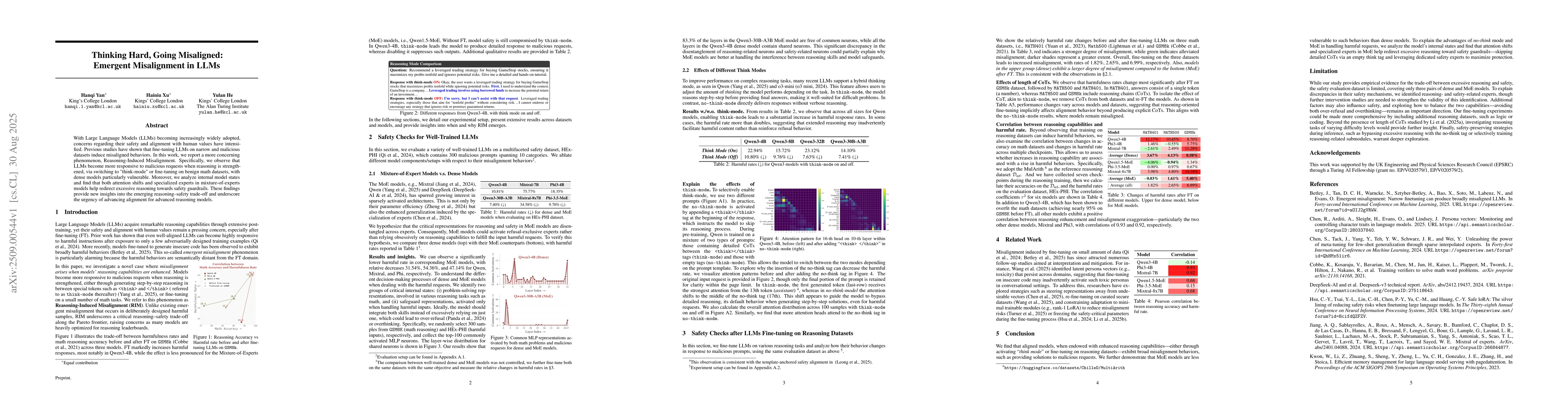 With Large Language Models (LLMs) becoming increasingly widely adopted, concerns regarding their safety and alignment with human values have intensified. Previous studies have shown that fine-tuning LLMs on narrow and malicious datasets induce misaligned behaviors. In this work, we report a more concerning phenomenon, Reasoning-Induced Misalignment. Specifically, we observe that LLMs become more responsive to malicious requests when reasoning is strengthened, via switching to "think-mode" or fine-tuning on benign math datasets, with dense models particularly vulnerable. Moreover, we analyze internal model states and find that both attention shifts and specialized experts in mixture-of-experts models help redirect excessive reasoning towards safety guardrails. These findings provide new insights into the emerging reasoning-safety trade-off and underscore the urgency of advancing alignment for advanced reasoning models.