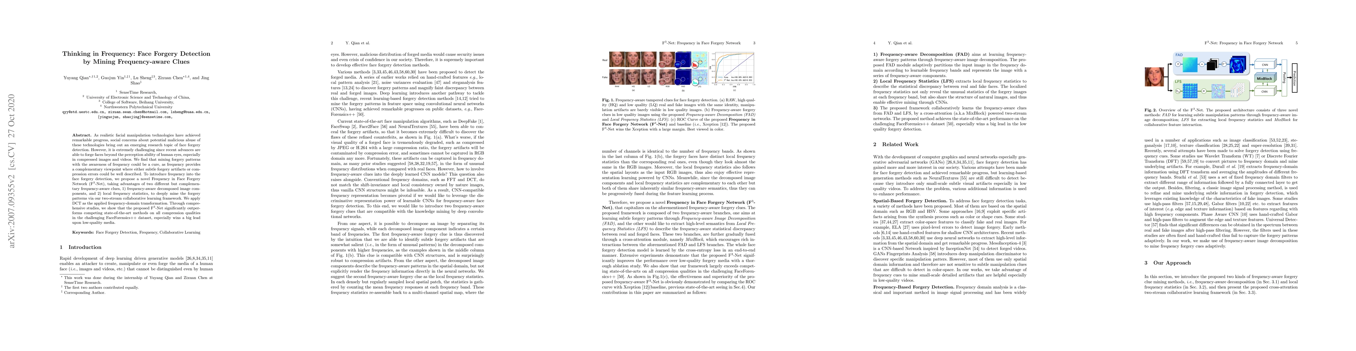 This paper proposes a novel Frequency in Face Forgery Network (F3-Net) to detect face forgeries by leveraging frequency-aware clues, including decomposed image components and local frequency statistics. The method significantly outperforms existing techniques, especially in low-quality compressed images, as demonstrated on the FaceForensics++ dataset.