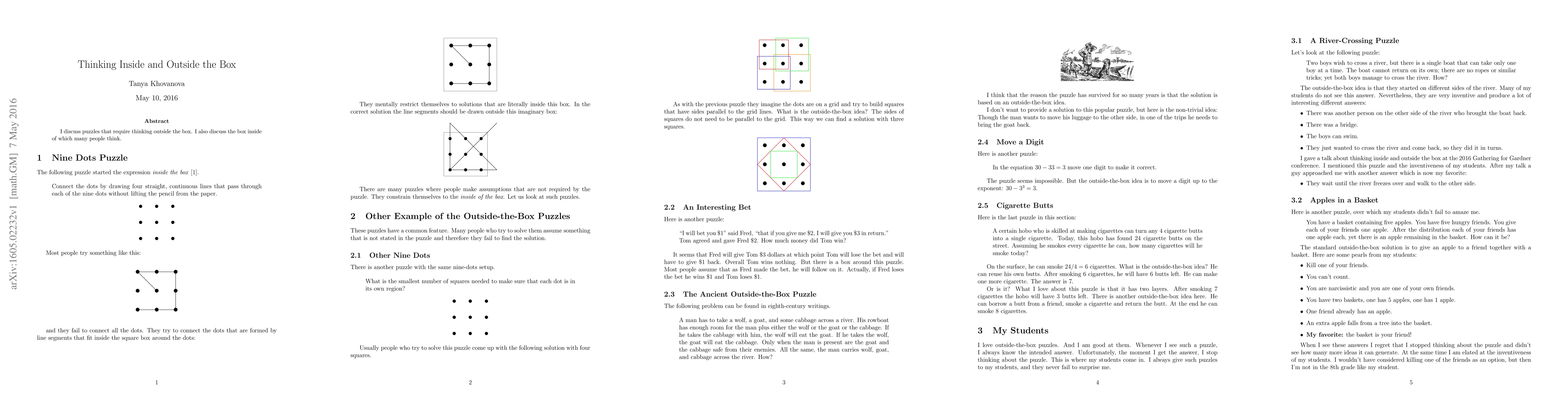I discuss puzzles that require thinking outside the box. I also discuss the box inside of which many people think.