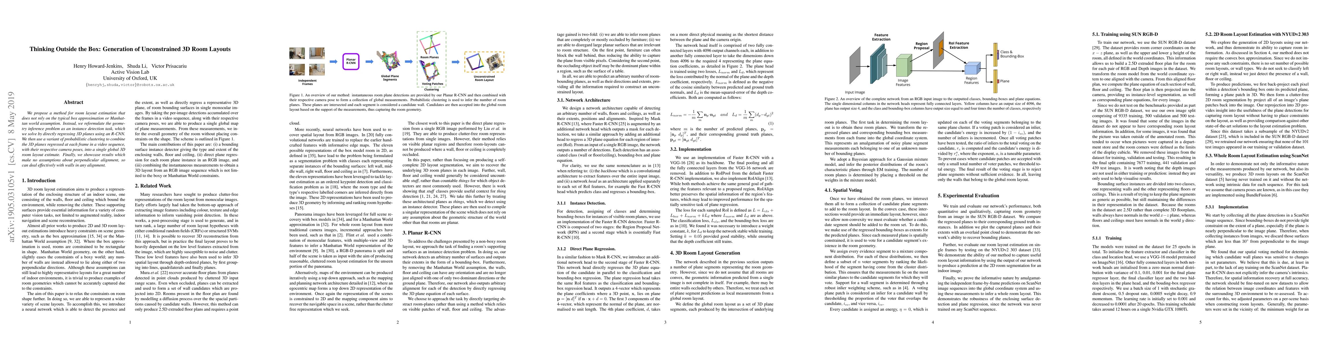 This paper introduces a novel method for estimating 3D room layouts without relying on box approximations or Manhattan world assumptions. It uses an R-CNN to directly regress 3D planes and combines them via probabilistic clustering to generate unconstrained room layouts.