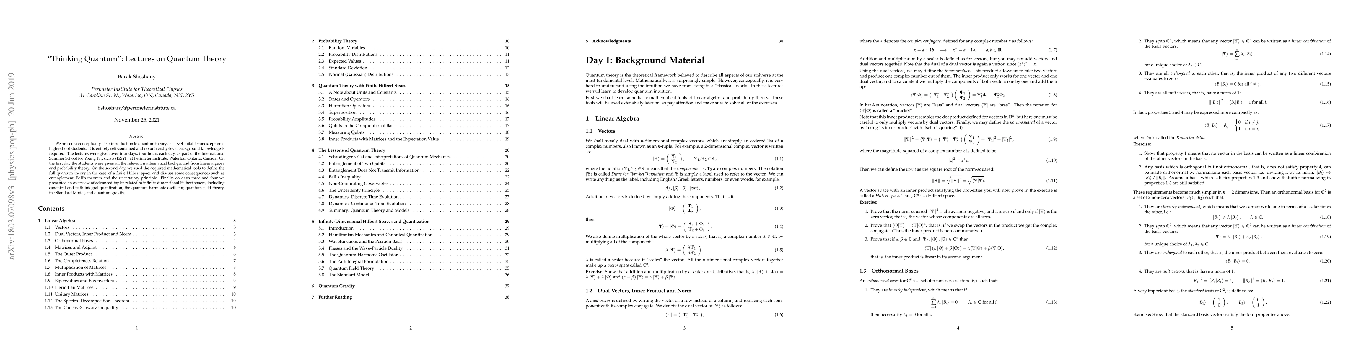 We present a conceptually clear introduction to quantum theory at a level suitable for exceptional high-school students. It is entirely self-contained and no university-level background knowledge is required. The lectures were given over four days, four hours each day, as part of the International Summer School for Young Physicists (ISSYP) at Perimeter Institute, Waterloo, Ontario, Canada. On the first day the students were given all the relevant mathematical background from linear algebra and probability theory. On the second day, we used the acquired mathematical tools to define the full quantum theory in the case of a finite Hilbert space and discuss some consequences such as entanglement, Bell's theorem and the uncertainty principle. Finally, on days three and four we presented an overview of advanced topics related to infinite-dimensional Hilbert spaces, including canonical and path integral quantization, the quantum harmonic oscillator, quantum field theory, the Standard Model, and quantum gravity.