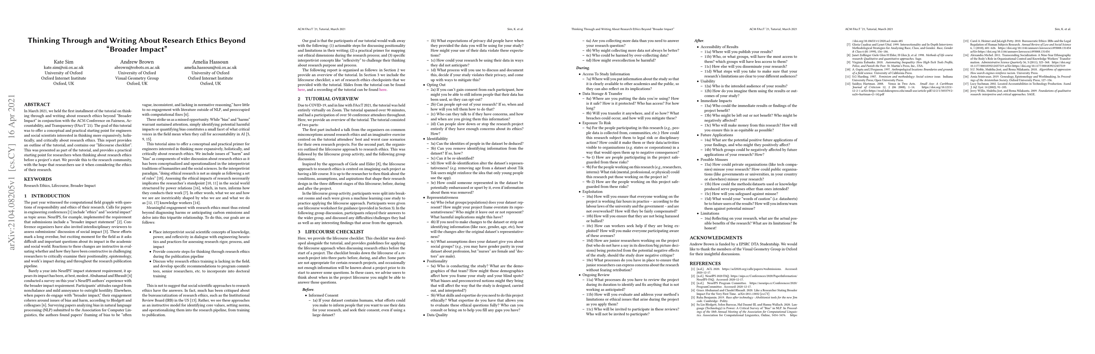In March 2021, we held the first instalment of the tutorial on thinking through and writing about research ethics beyond 'Broader Impact' in conjunction with the ACM Conference on Fairness, Accountability, and Transparency (FAccT '21). The goal of this tutorial was to offer a conceptual and practical starting point for engineers and social scientists interested in thinking more expansively, holistically, and critically about research ethics. This report provides an outline of the tutorial, and contains our 'lifecourse checklist'. This was presented as part of the tutorial, and provides a practical starting point for researchers when thinking about research ethics before a project's start. We provide this to the research community, with the hope that researchers use it when considering the ethics of their research.