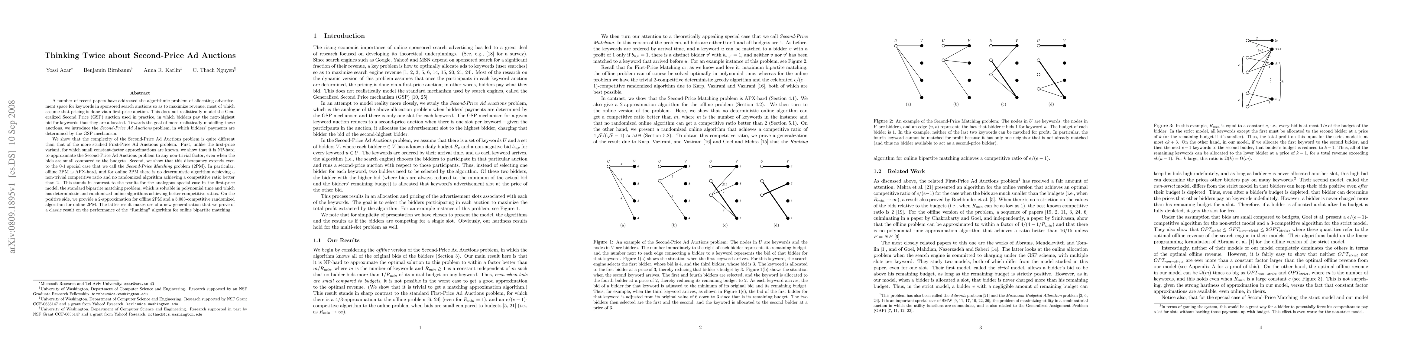 This paper explores the algorithmic challenges of allocating advertisement space using Generalized Second Price (GSP) auctions, contrasting it with the more studied first-price model. It demonstrates that GSP auctions are NP-hard to approximate and significantly more complex, with no non-trivial deterministic or randomized online algorithms for the matching problem. However, it provides a 2-approximation for offline and a 5.083-competitive randomized algorithm for online scenarios.