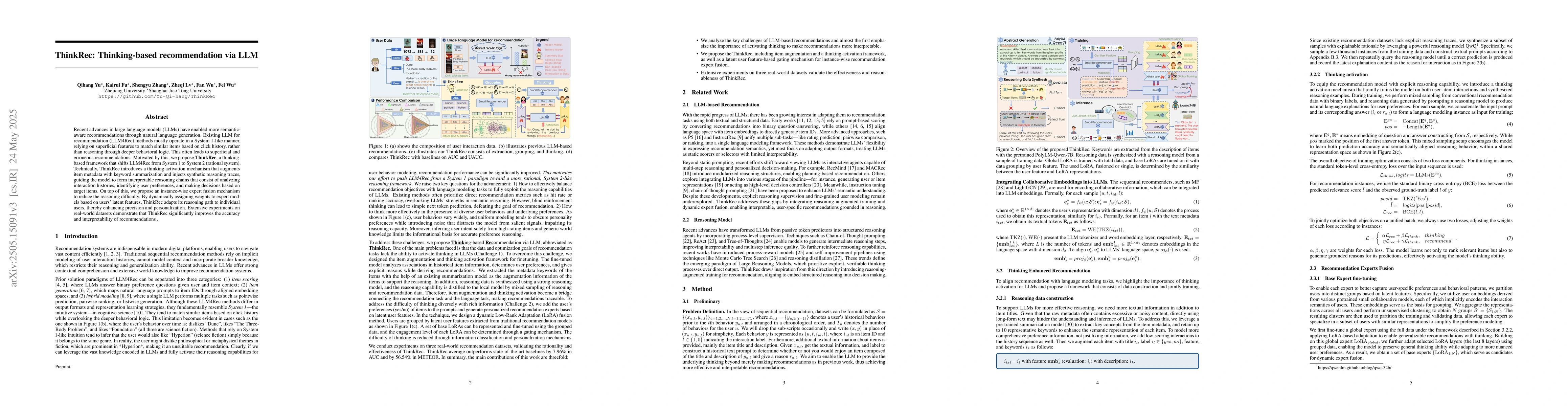 ThinkRec introduces a thinking activation mechanism that enhances item metadata with keyword summarization and synthetic reasoning traces, guiding the model to construct interpretable reasoning chains. It also proposes an instance-wise expert fusion mechanism to adapt reasoning paths based on users' latent features.