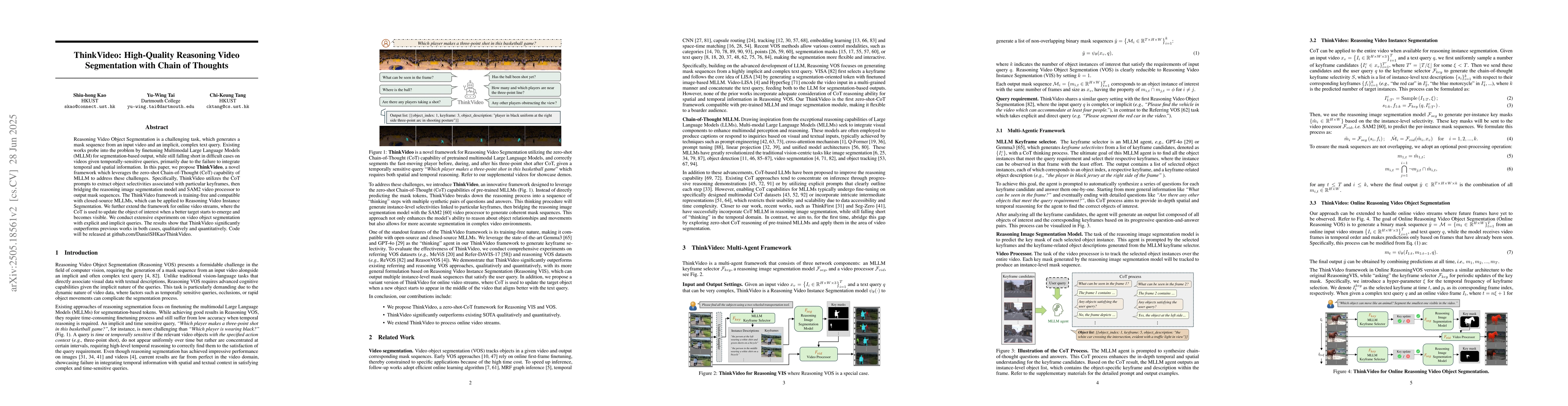 ThinkVideo proposes a novel framework that leverages the zero-shot Chain-of-Thought (CoT) capability of Multimodal Large Language Models (MLLM) for high-quality Reasoning Video Segmentation. It extracts object selectivities associated with keyframes and bridges the gap between a reasoning image segmentation model and SAM2 video processor.