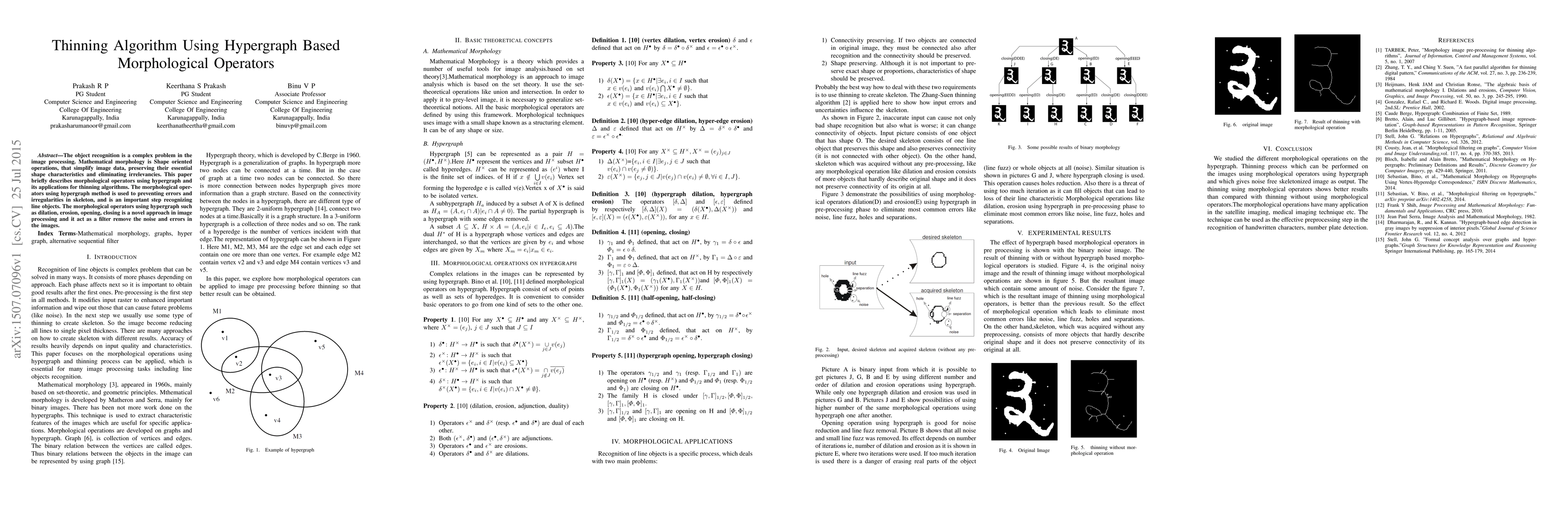 This paper proposes a thinning algorithm using hypergraph-based morphological operators to improve object recognition in image processing by preserving essential shapes and eliminating noise, thereby reducing errors in skeletonization. The approach utilizes dilation, erosion, opening, and closing operations to filter out noise and irregularities.