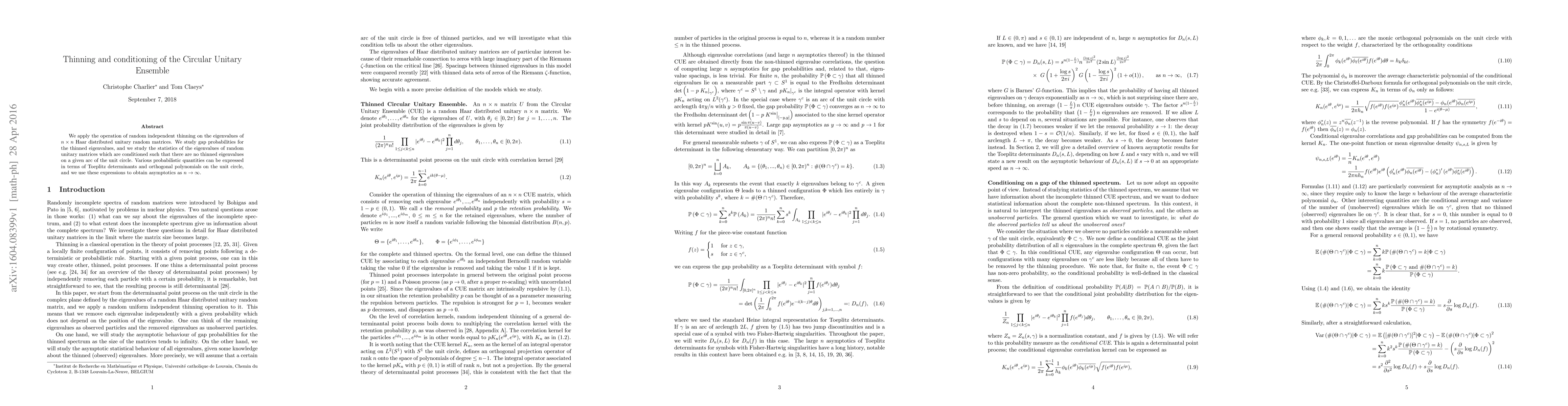 We apply the operation of random independent thinning on the eigenvalues of $n\times n$ Haar distributed unitary random matrices. We study gap probabilities for the thinned eigenvalues, and we study the statistics of the eigenvalues of random unitary matrices which are conditioned such that there are no thinned eigenvalues on a given arc of the unit circle. Various probabilistic quantities can be expressed in terms of Toeplitz determinants and orthogonal polynomials on the unit circle, and we use these expressions to obtain asymptotics as $n\to\infty$.