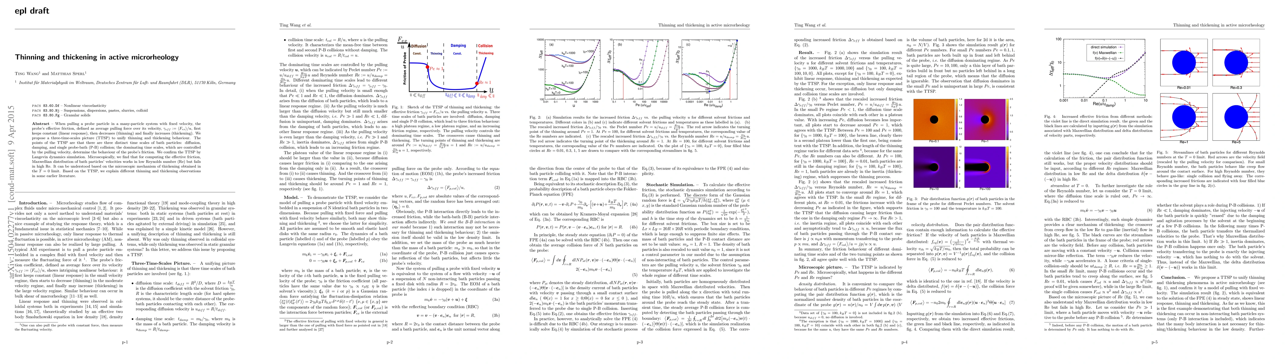 When pulling a probe particle in a many-particle system with fixed velocity, the probe's effective friction, defined as average pulling force over its velocity, $\gamma_{eff}:=\langle F_{ex}\rangle/u$, first keeps constant (linear response), then decreases (thinning) and finally increases (thickening). We propose a three-time-scales picture (TTSP) to unify thinning and thickening behaviour. The points of the TTSP are that there are three distinct time scales of bath particles: diffusion, damping, and single probe-bath (P-B) collision; the dominating time scales, which are controlled by the pulling velocity, determine the behaviour of the probe's friction. We confirm the TTSP by Langevin dynamics simulation. Microscopically, we find that for computing the effective friction, Maxwellian distribution of bath particles' velocities works in low Reynolds number (Re) but fails in high Re. It can be understood based on the microscopic mechanism of thickening obtained in the $T=0$ limit. Based on the TTSP, we explain different thinning and thickening observations in some earlier literature.