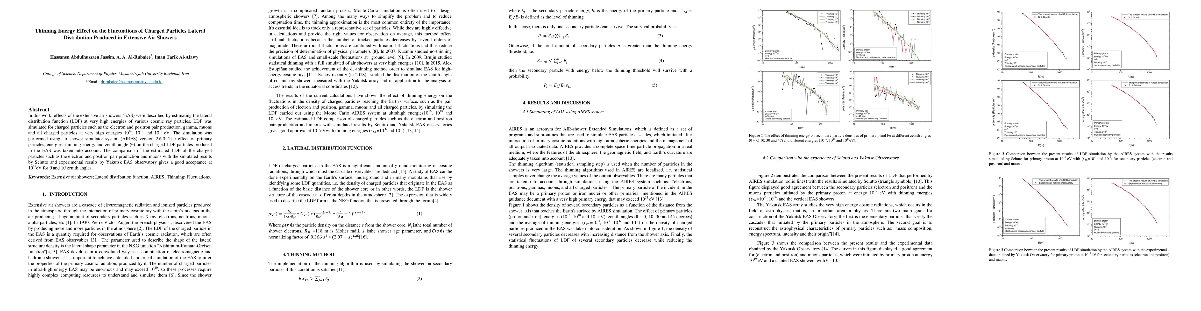 In this work, the effects of the extensive air showers (EAS) were described by estimating the lateral distribution function (LDF) at very high energies of various cosmic ray particles. LDF was simulated for charged particles such as the electron and positron pair production, gamma, muons and all charged particles at very high energies 10^16, 10^18 and 10^19 eV. The simulation was performed using air shower simulator system (AIRES) version 2.6.0. The effect of primary particles, energies, thinning energy and zenith angle on the charged LDF particles produced in the EAS was taken into account. The comparison of the estimated LDF of charged particles such as the electron and positron pair production and muons with the simulated results by Sciutto and experimental results by Yakutsk EAS observatory gives a good acceptance at the energy 10^19 eV for 0 and 10 zenith angles.
