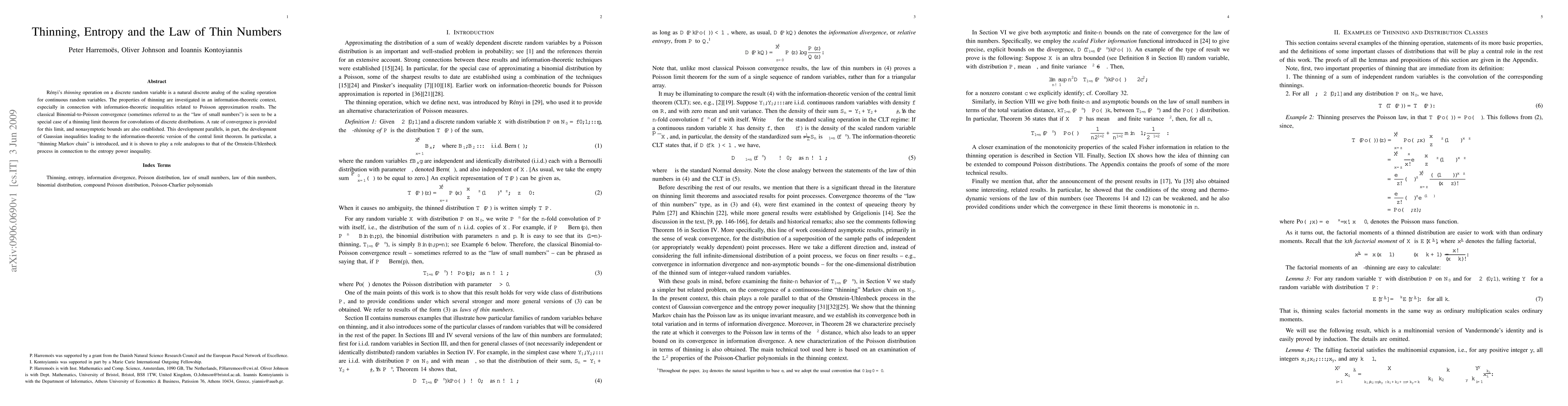 Renyi's "thinning" operation on a discrete random variable is a natural discrete analog of the scaling operation for continuous random variables. The properties of thinning are investigated in an information-theoretic context, especially in connection with information-theoretic inequalities related to Poisson approximation results. The classical Binomial-to-Poisson convergence (sometimes referred to as the "law of small numbers" is seen to be a special case of a thinning limit theorem for convolutions of discrete distributions. A rate of convergence is provided for this limit, and nonasymptotic bounds are also established. This development parallels, in part, the development of Gaussian inequalities leading to the information-theoretic version of the central limit theorem. In particular, a "thinning Markov chain" is introduced, and it is shown to play a role analogous to that of the Ornstein-Uhlenbeck process in connection to the entropy power inequality.