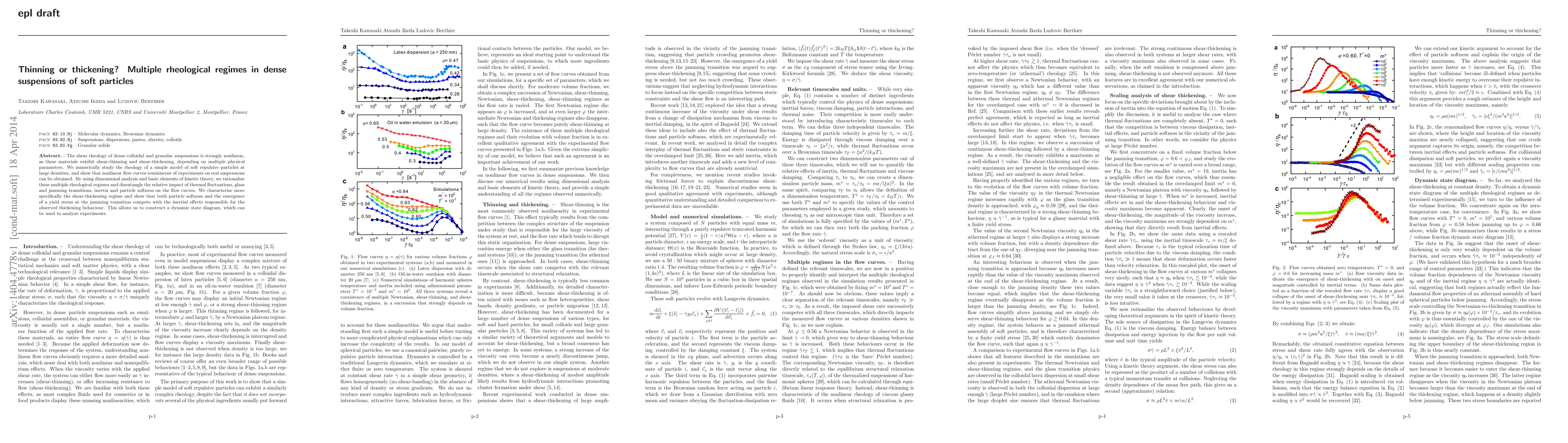 This paper investigates the complex rheology of dense suspensions of soft repulsive particles, demonstrating both shear-thinning and shear-thickening behaviors. Through numerical simulations and theoretical analysis, the authors elucidate the factors influencing these regimes, including thermal fluctuations, jamming transitions, and particle softness.