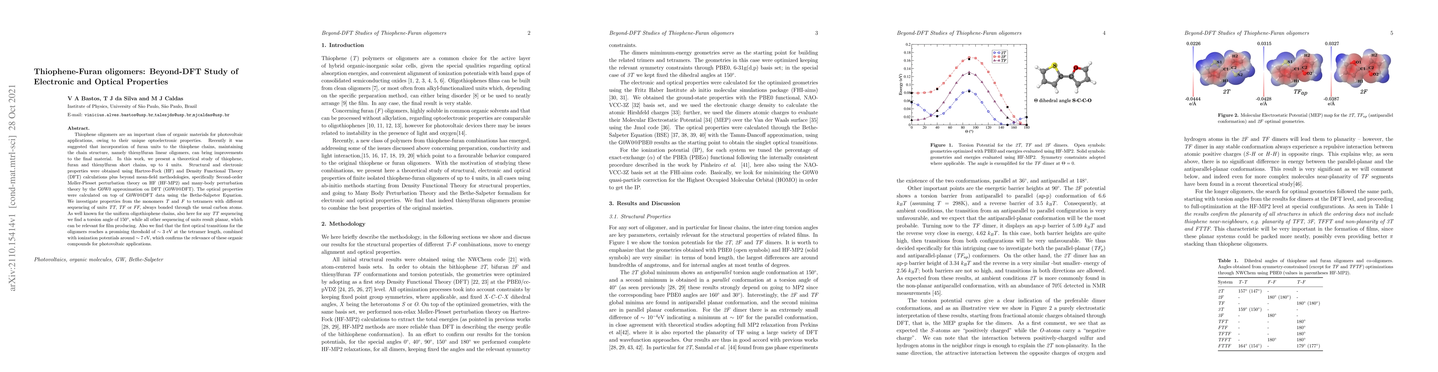 This study investigates the electronic and optical properties of thiophene, furan, and thienylfuran oligomers using advanced computational methods beyond DFT, including HF-MP2 and G0W0@DFT. The research reveals that while uniform thiophene tetramers maintain a torsion angle of $150^{\circ}$, mixed sequences remain planar, potentially impacting film formation. The first optical transitions in the tetramers reach $\sim 3$ eV, alongside ionization potentials around $\sim 7$ eV, indicating their suitability for photovoltaic applications.