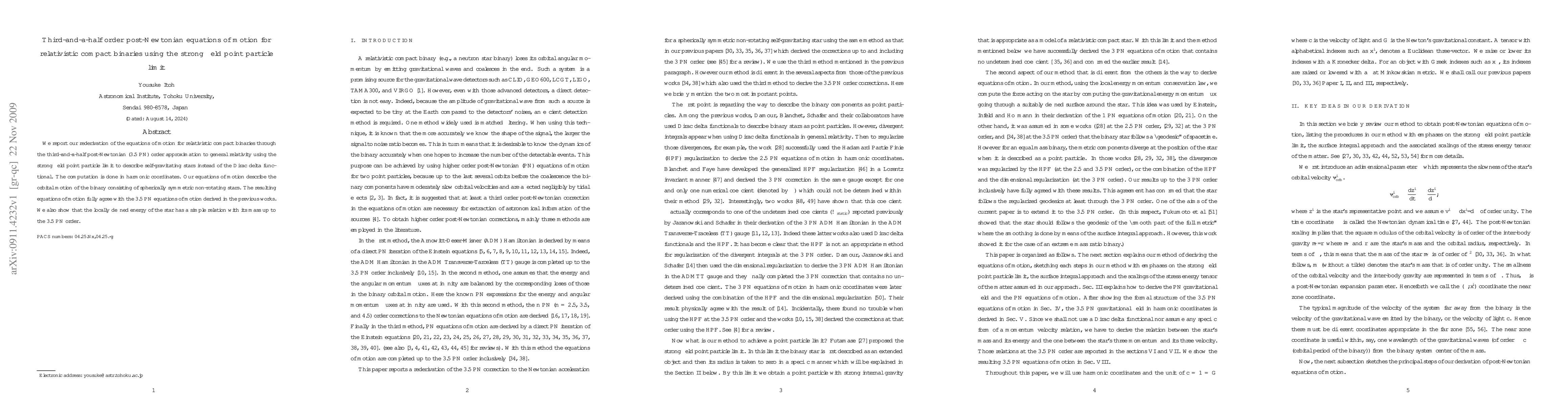 We report our rederivation of the equations of motion for relativistic compact binaries through the third-and-a-half post-Newtonian (3.5 PN) order approximation to general relativity using the strong field point particle limit to describe self-gravitating stars instead of the Dirac delta functional. The computation is done in harmonic coordinates. Our equations of motion describe the orbital motion of the binary consisting of spherically symmetric non-rotating stars. The resulting equations of motion fully agree with the 3.5 PN equations of motion derived in the previous works. We also show that the locally defined energy of the star has a simple relation with its mass up to the 3.5 PN order.